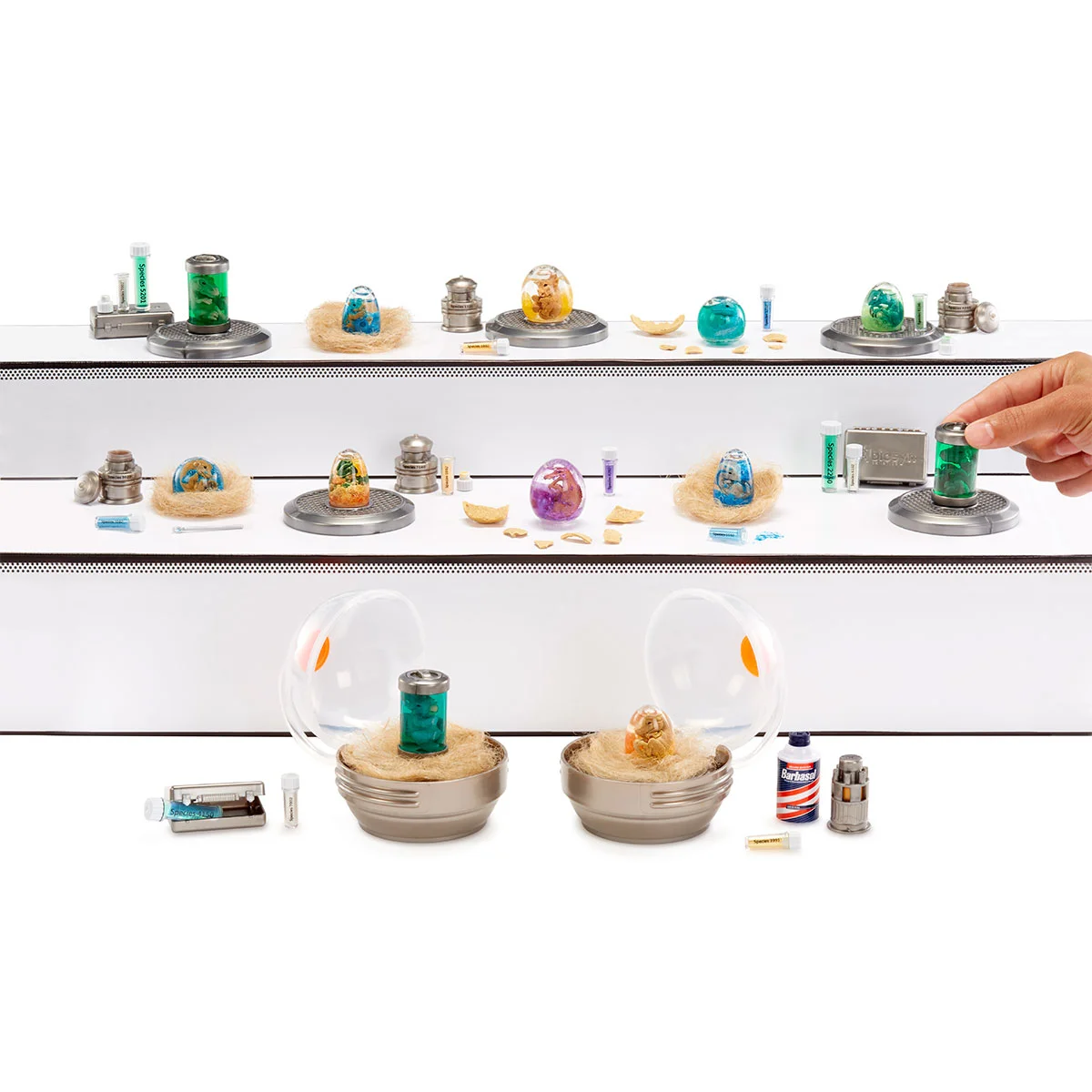 - Створіть! Порівняйте вміст кульки з листом колекціонера, щоб визначити, який динозавр потрапив саме до вас. За інструкцією введіть «гліттерний ДНК-порошок» і рідину в яйце або циліндр, струсіть — і спостерігайте, як з’являється ваш іграшковий динозавр. Це науковий експеримент у мініатюрі!