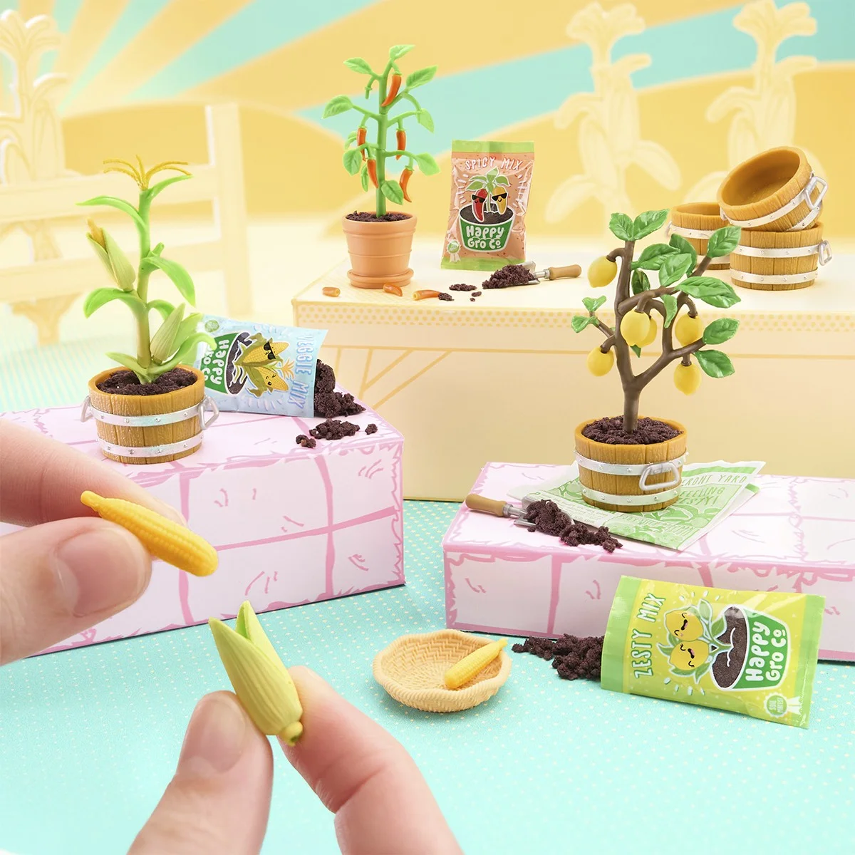 - Розпакуйте! Кожна кулька містить реалістичні мініатюрні елементи саду й городу: квітучі кущі, бонсай, венерину мухоловку, фіалки, лимонне деревце, вазони з перчиком чи кукурудзою, а також чарівні візки з квітами! Який саме набір вам дістанеться — дізнаєтеся лише після розпакування!