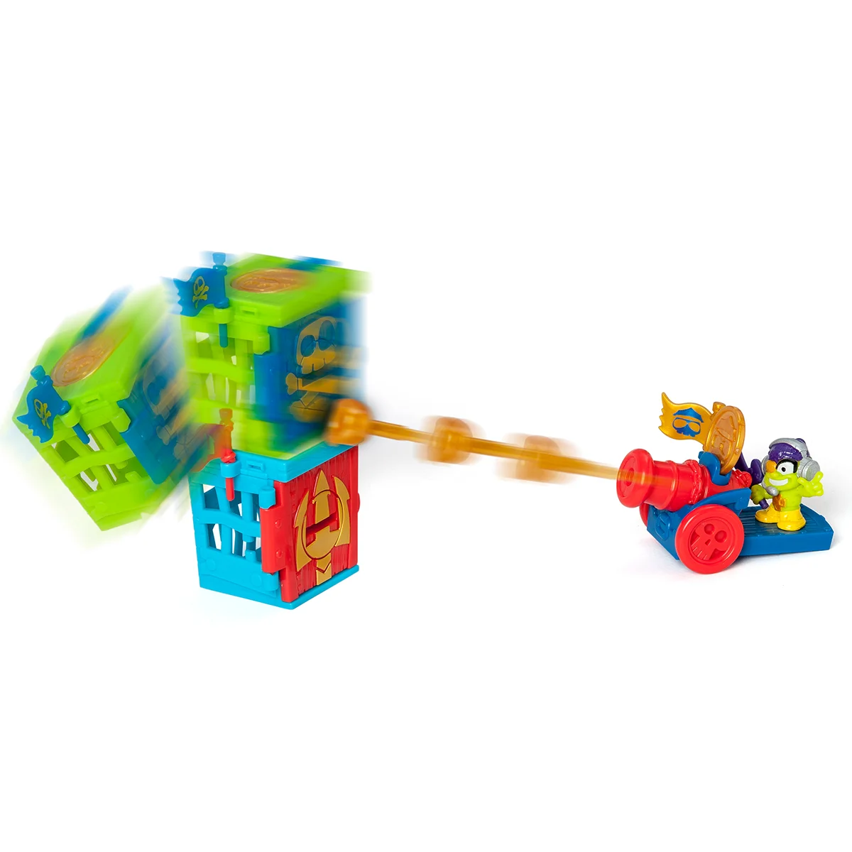 - На платформі за гарматою закріпіть вашого пірата за виступ. Завдяки рухомим колесам покотіть гармату у необхідне місце, вставте іграшковий снаряд у гармату до звуку «клік», вставте і натисніть монетою у виступ на гарматі. Спостерігайте за епічним пуском!