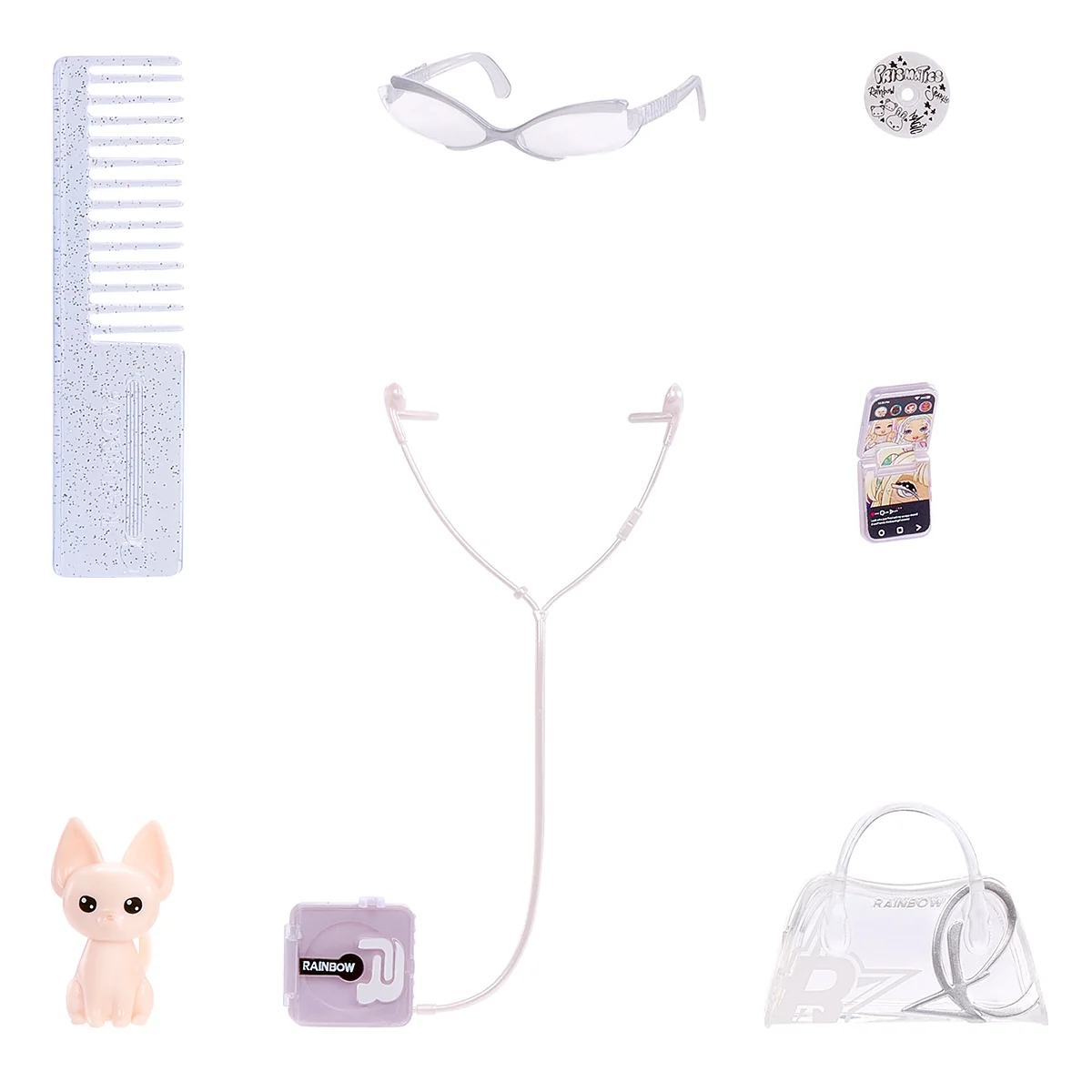 1, 1 боді, 1 куртка, 1 лялька, 1 сумочка, 1 спідниця, 1 пара взуття, 1 фігурка кота, 1 пара окулярів