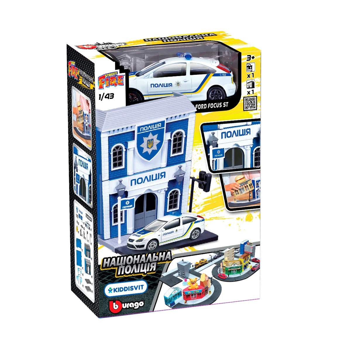 Ігровий набір серії Bburago City - НАЦІОНАЛЬНА ПОЛІЦЯ - включає будиночок-відділ зі світлофором та функціональними дверима та металеву модель поліцейського автомобіля Ford Focus ST в масштабі 1:43.