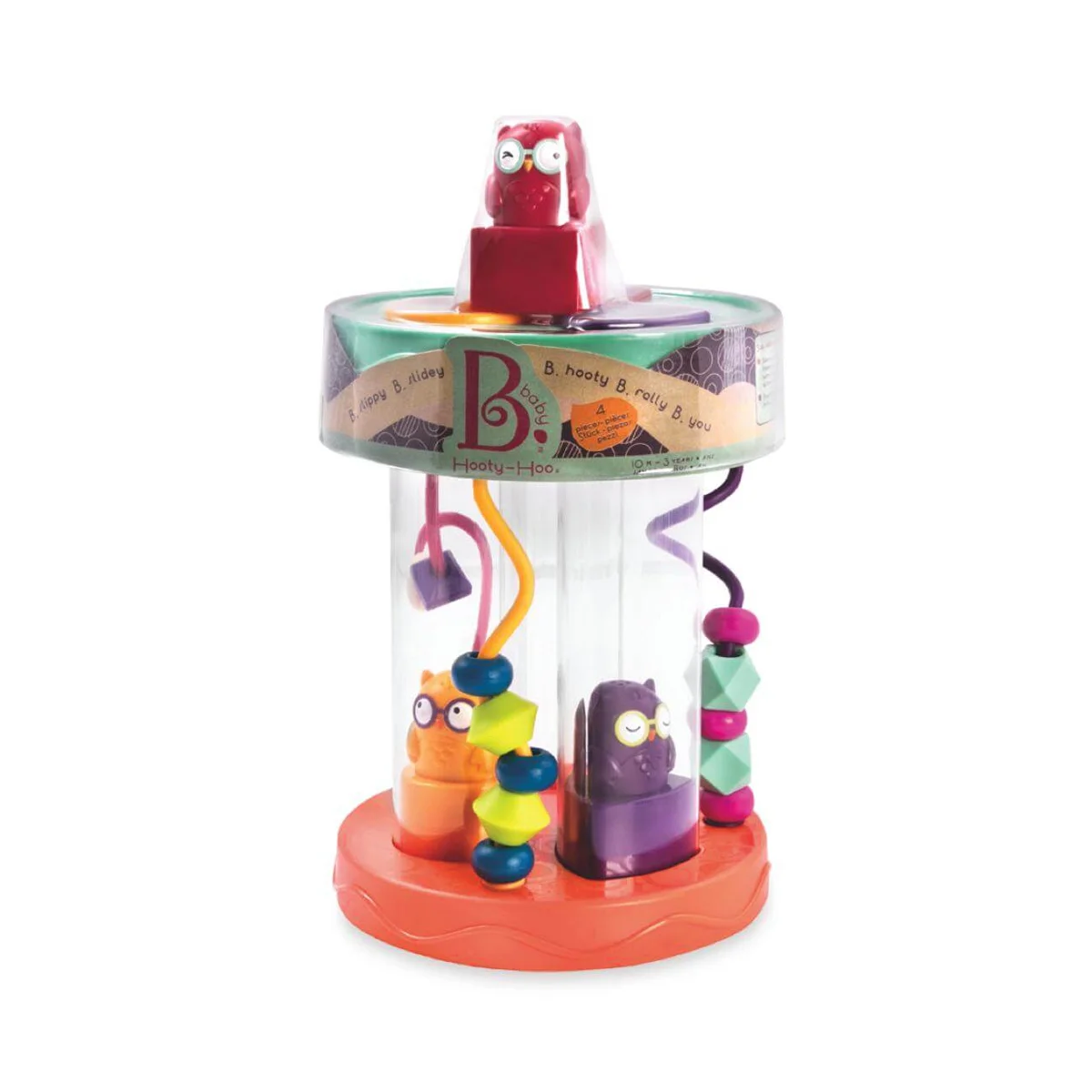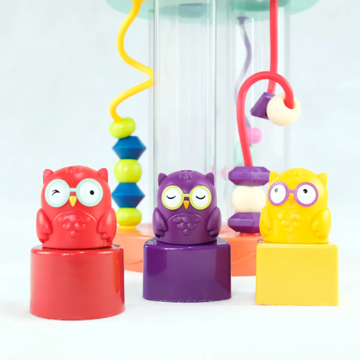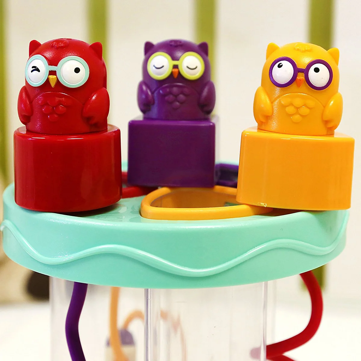 Три фігурки-сови повільно опускаються уздовж відповідного отвору-сортера з м'яким кумедним звуком, схожим на совине «УГУУУУУУУУУ».