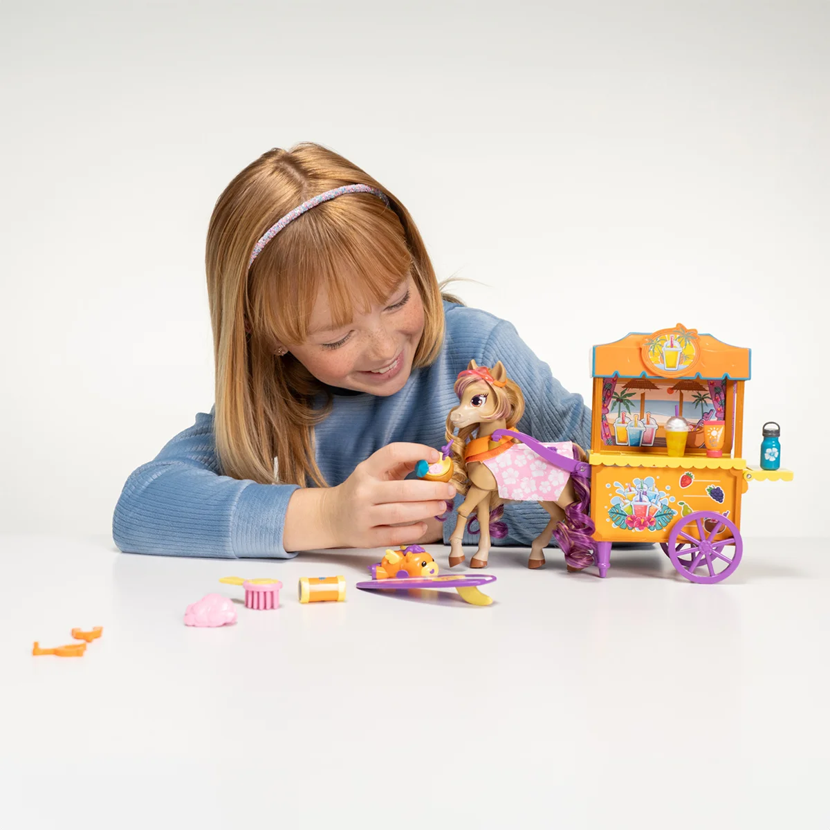 Пориньте в атмосферу пляжу й моря з конячкою Бейлі! Вона обожнює проводити час на пляжі, займатися серфінгом, а також робити чай боба для своїх відвідувачів. Пурпурові прядки у її гриві та хвостику означають її особливий зв’язок із природою і те, що вона дуже любить проводити час поза домом. У возику-крамничці Бейлі знайдеться усе необхідне для чудового відпочинку!