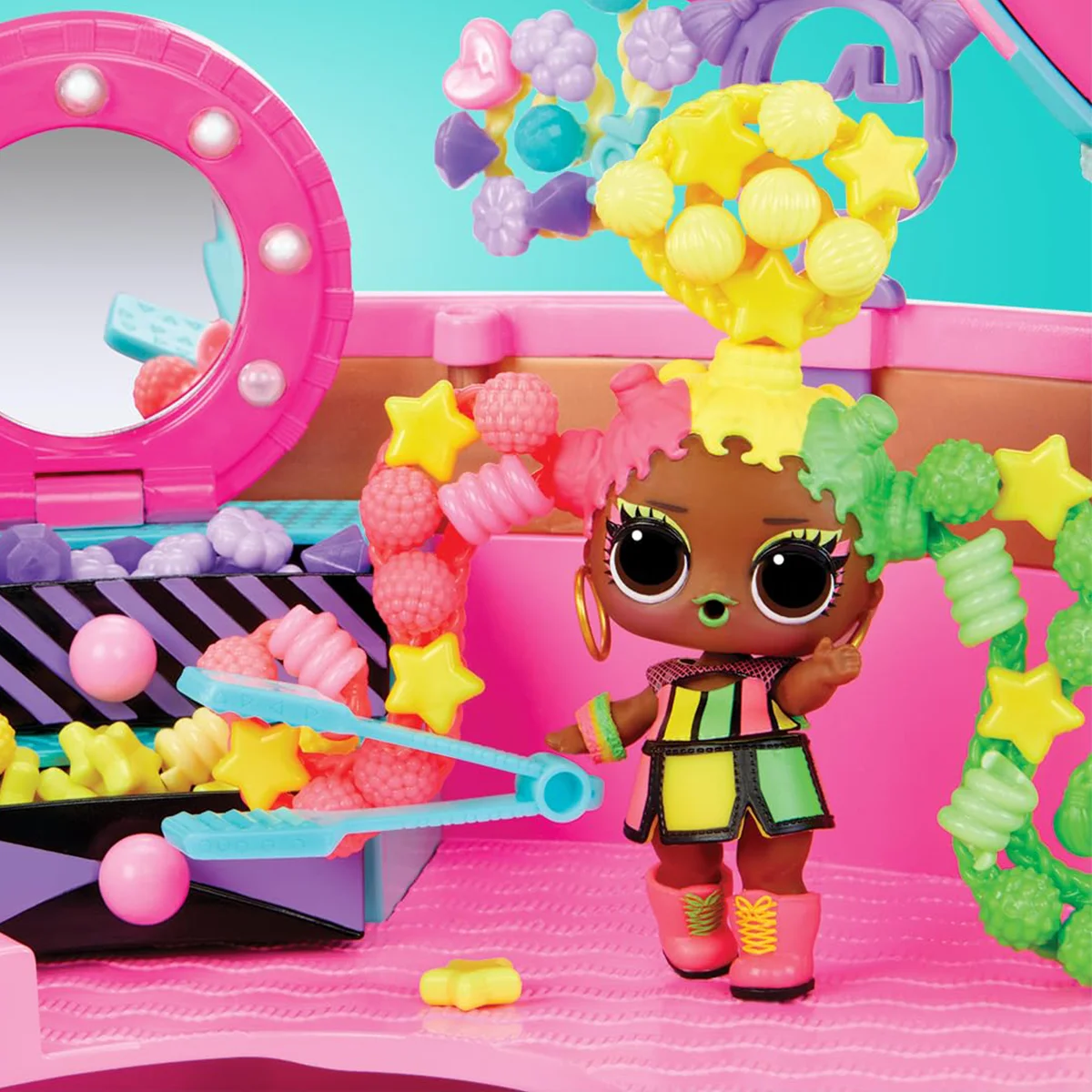Лялечка L.O.L. SURPRISE! збирається на найкращу вечірку цього року. Тільки Ви зможете її підготувати до цього свята та зробити лялечку найяскравішою та стильною. Зустрічайте ігровий набір з лялькою L.O.L. SURPRISE! - САЛОН ФЕЄРИЧНИХ ЗАЧІСОК З НАМИСТИНОК. Це розкладний набір у вигляді компактної сумочки блакитно-рожевого кольору, з ручкою-ланцюжком. Поринайте у творчість з L.O.L. SURPRISE!