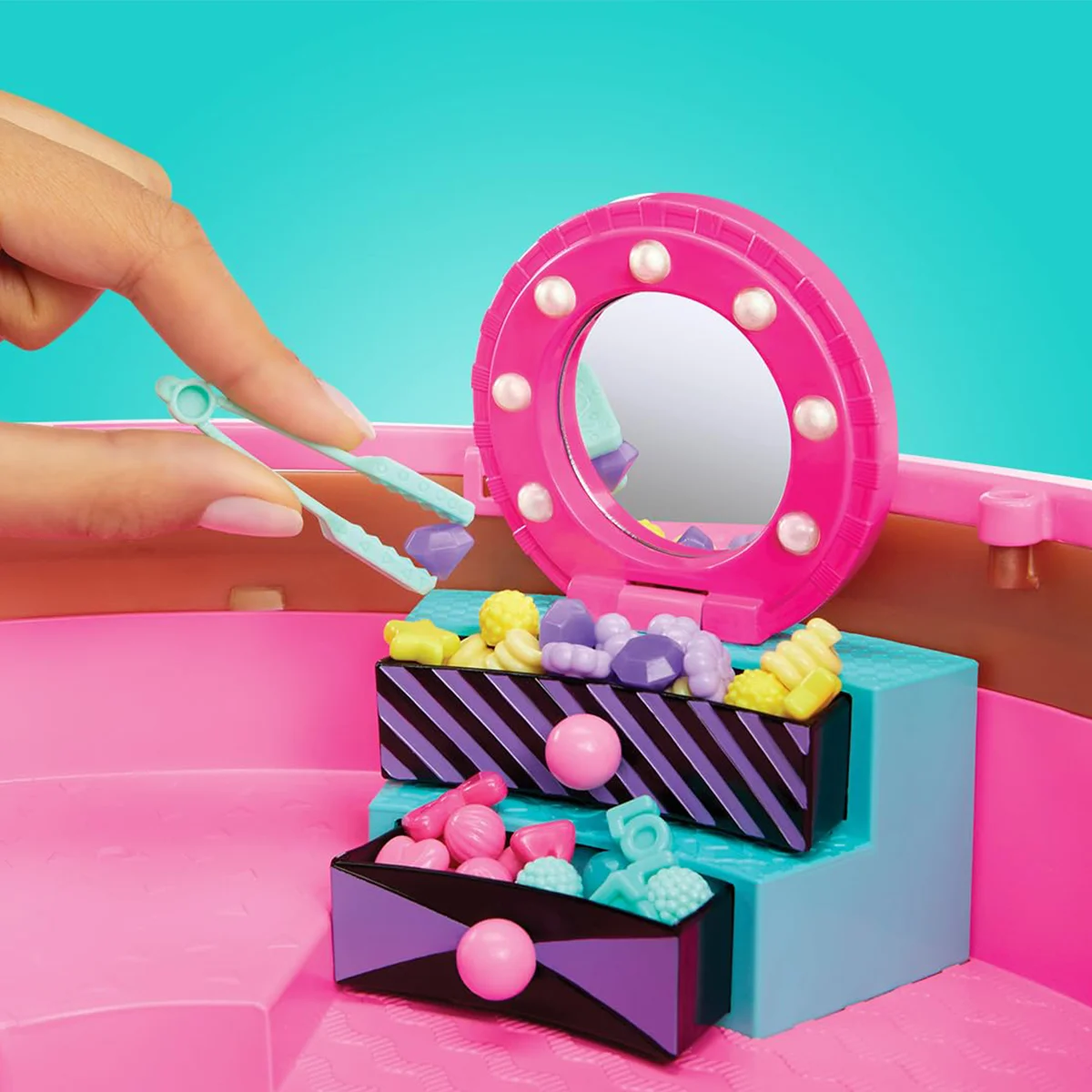 - Для створення зачіски з чарівних намистинок: покладіть лялечку на килимок, вставте основи для зачіски в спеціальні отвори та опустіть їх у воду. Розкладіть намистинки за допомогою пінцету та збризніть водою. Зачекайте 5-10 хвилин до повного висихання, і ваша фантастична зачіска для лялечки готова!