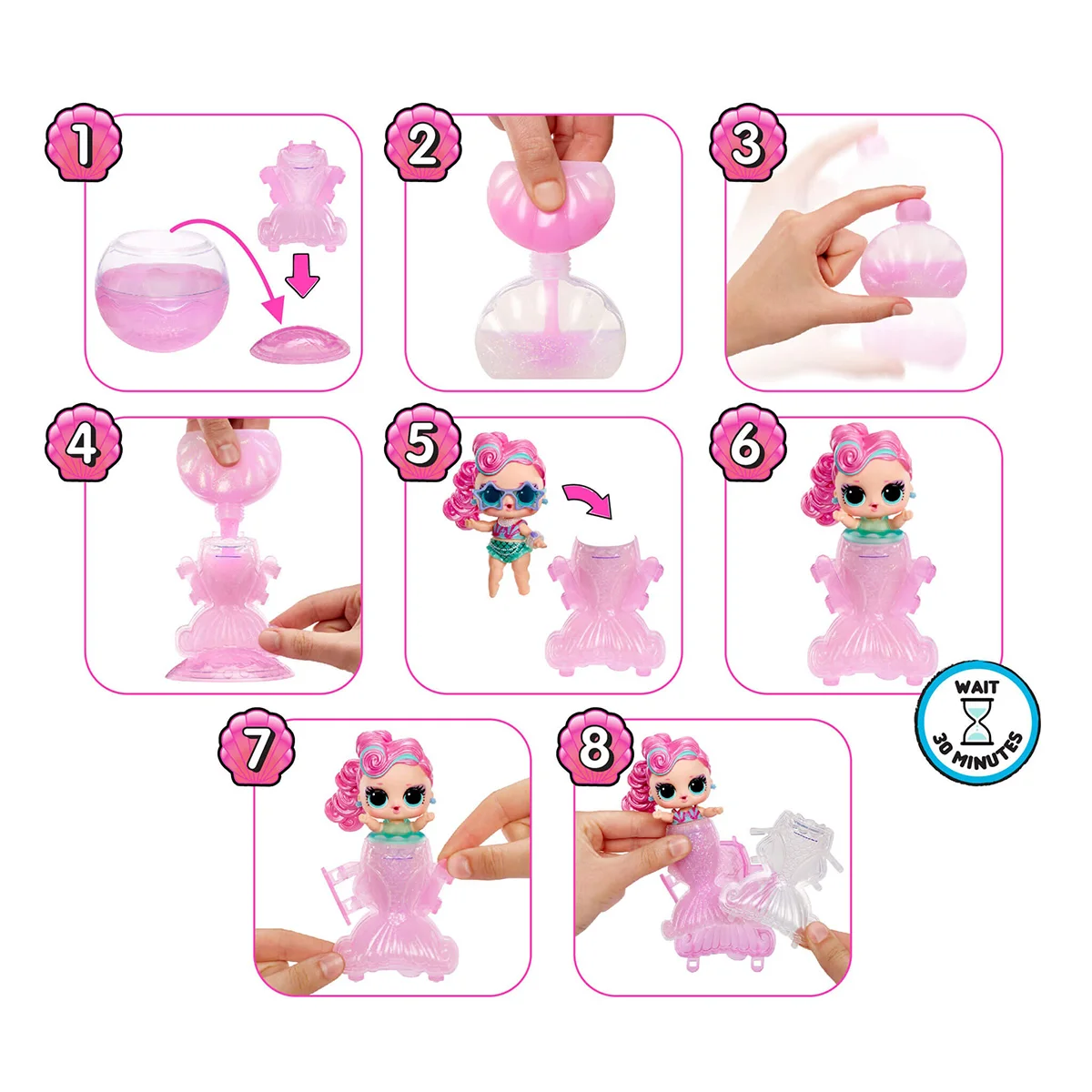 - Створіть чарівний хвіст для вашої русалоньки за допомогою сяючих гелів! Для цього встановіть форму для хвоста на підставку, додайте гель з кольорового флакона в білий (більший за розміром) та змішайте вміст для блискучого хвостика! Наповніть форму для хвостика гелем, поставте туди лялечку у рятувальному жилеті, закріпіть фіксаторами та почекайте 5-10 хвилин для застигання. Потім зніміть форму та поринайте у веселу гру!