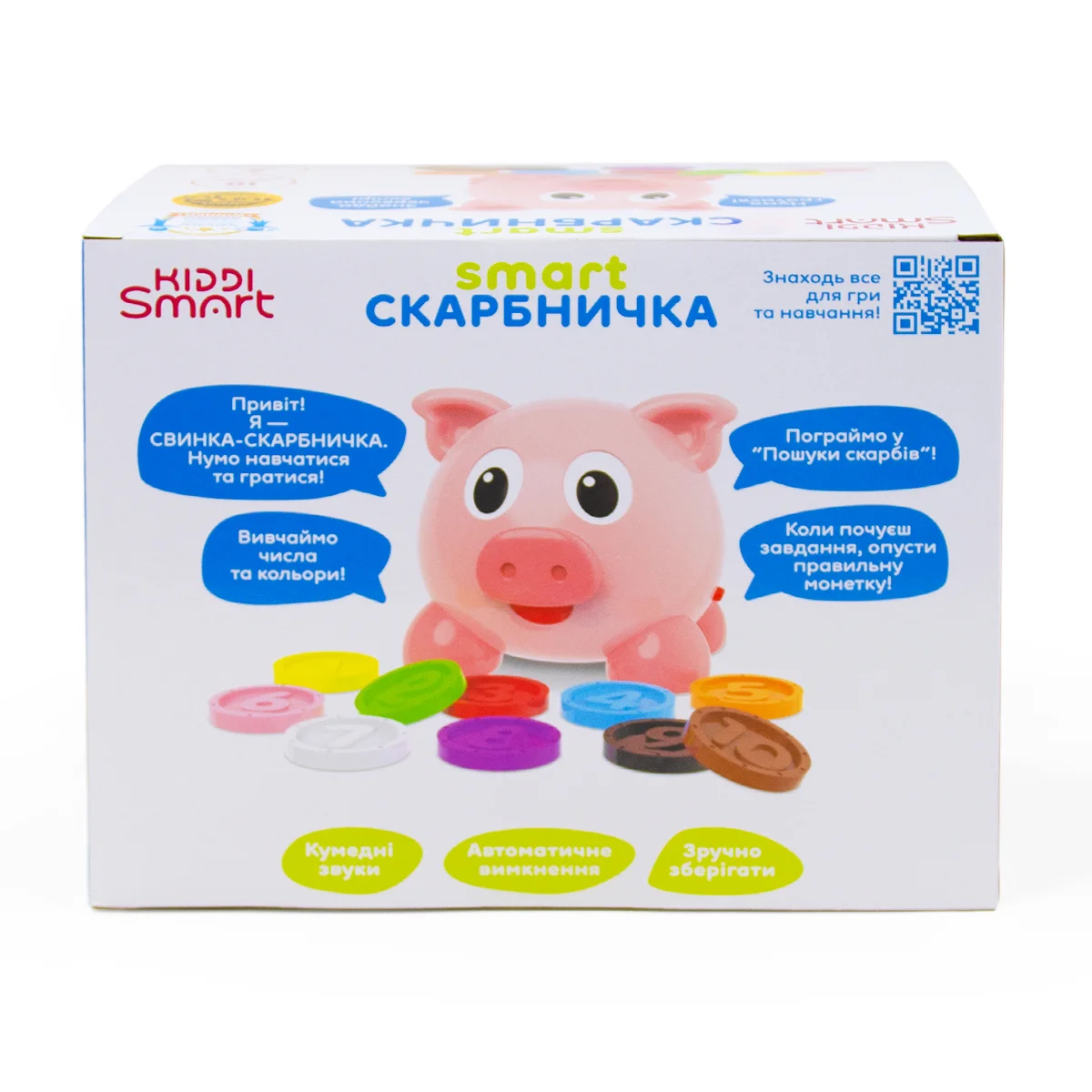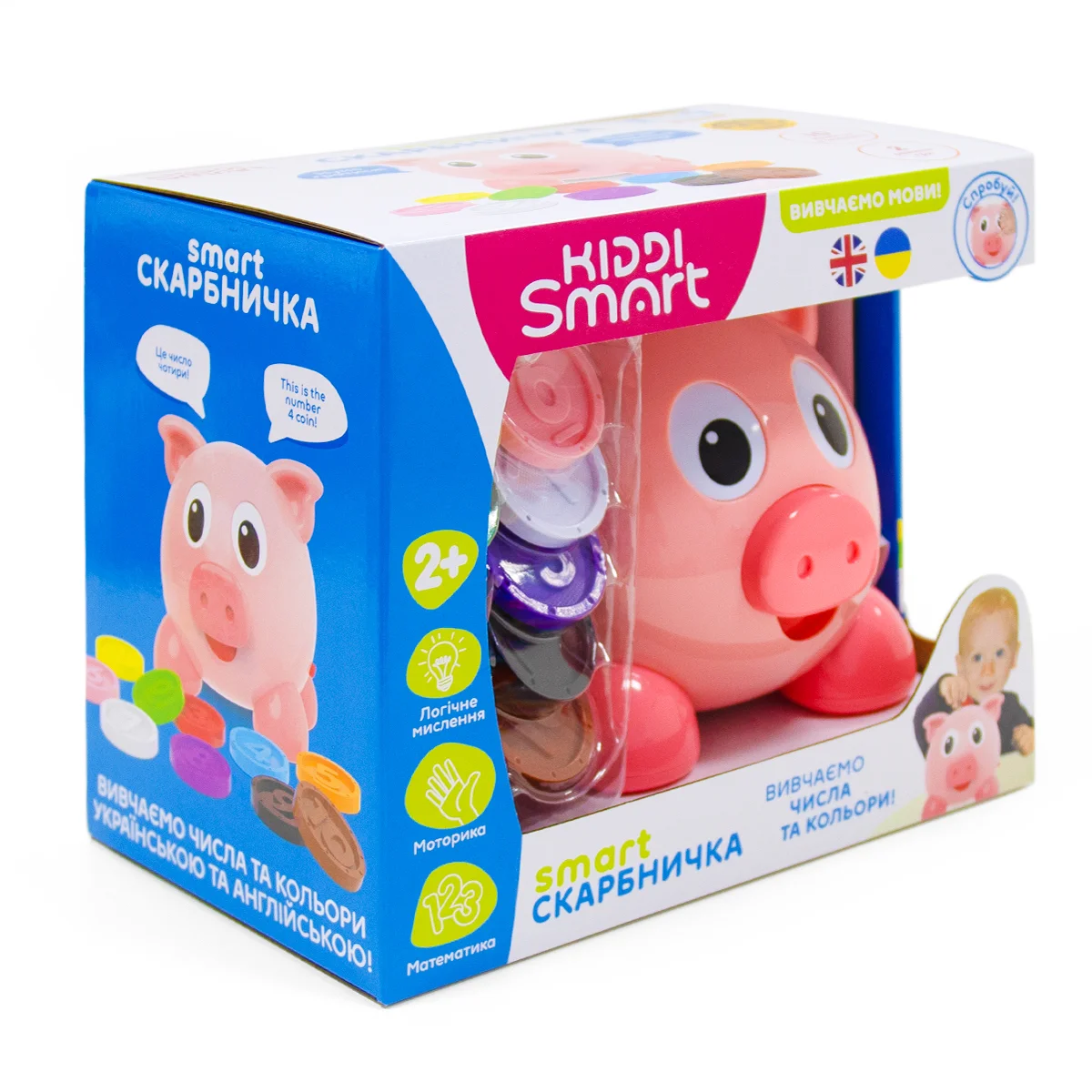 SMART-СКАРБНИЧКА – це інтерактивна двомовна іграшка, завдяки якій дитина вивчить числа та кольори українською та англійською мовами. А яскраві монетки зроблять гру ще цікавішою та веселішою! Нумо разом навчатися та гратися!