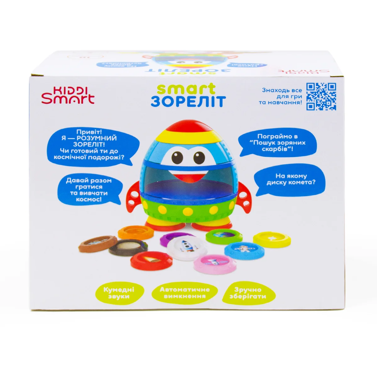 SMART-ЗОРЕЛІТ - це інтерактивна двомовна іграшка, завдяки якій дитина вивчить космос українською та англійською мовами. А яскраві диски з космічними об'єктами зроблять гру ще цікавішою та веселішою! Нумо разом навчатися та гратися!