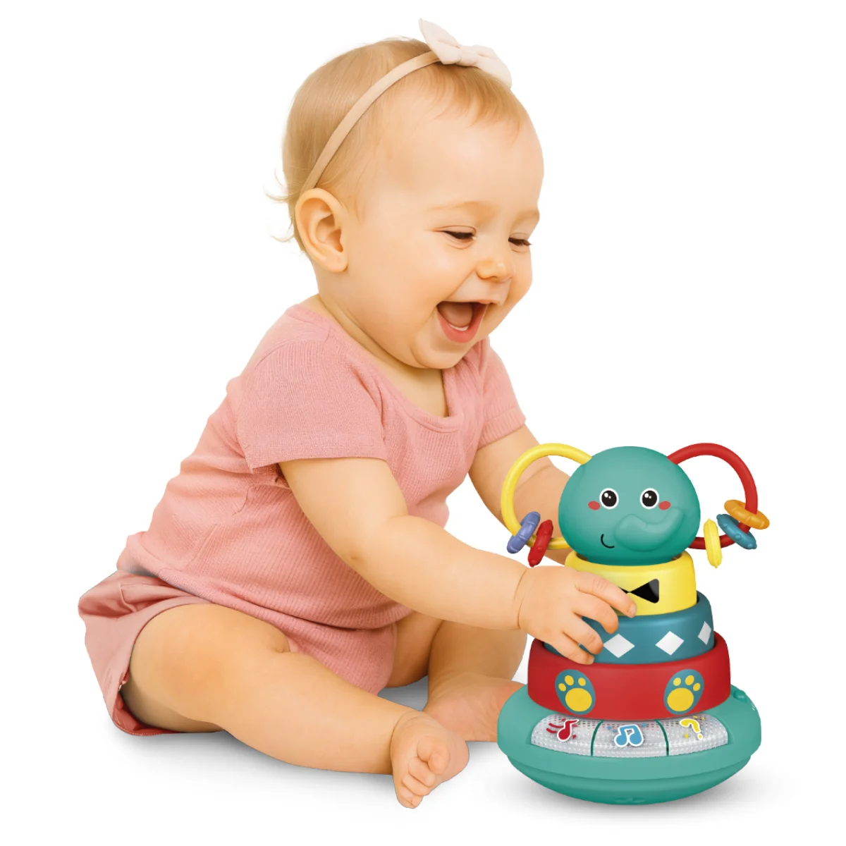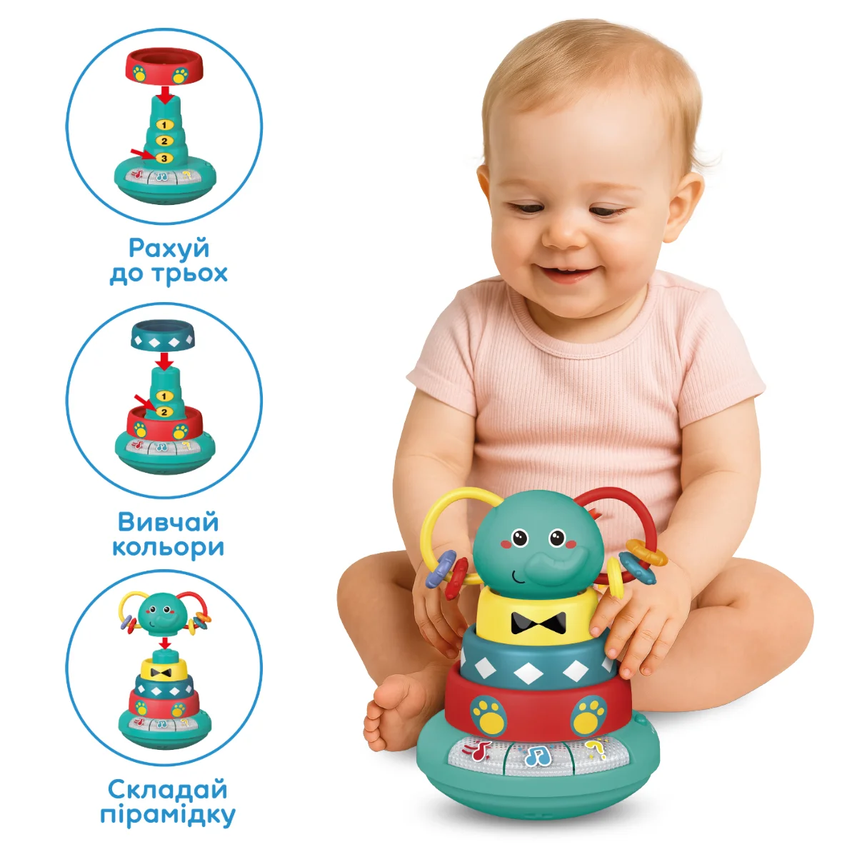 - Досліджуйте числа та кольори! Знімайте кільця-брязкальця з основи, щоби почути числа від 1 до 3. Якщо надягти кільця на основу, ви почуєте кольори кожного з них.