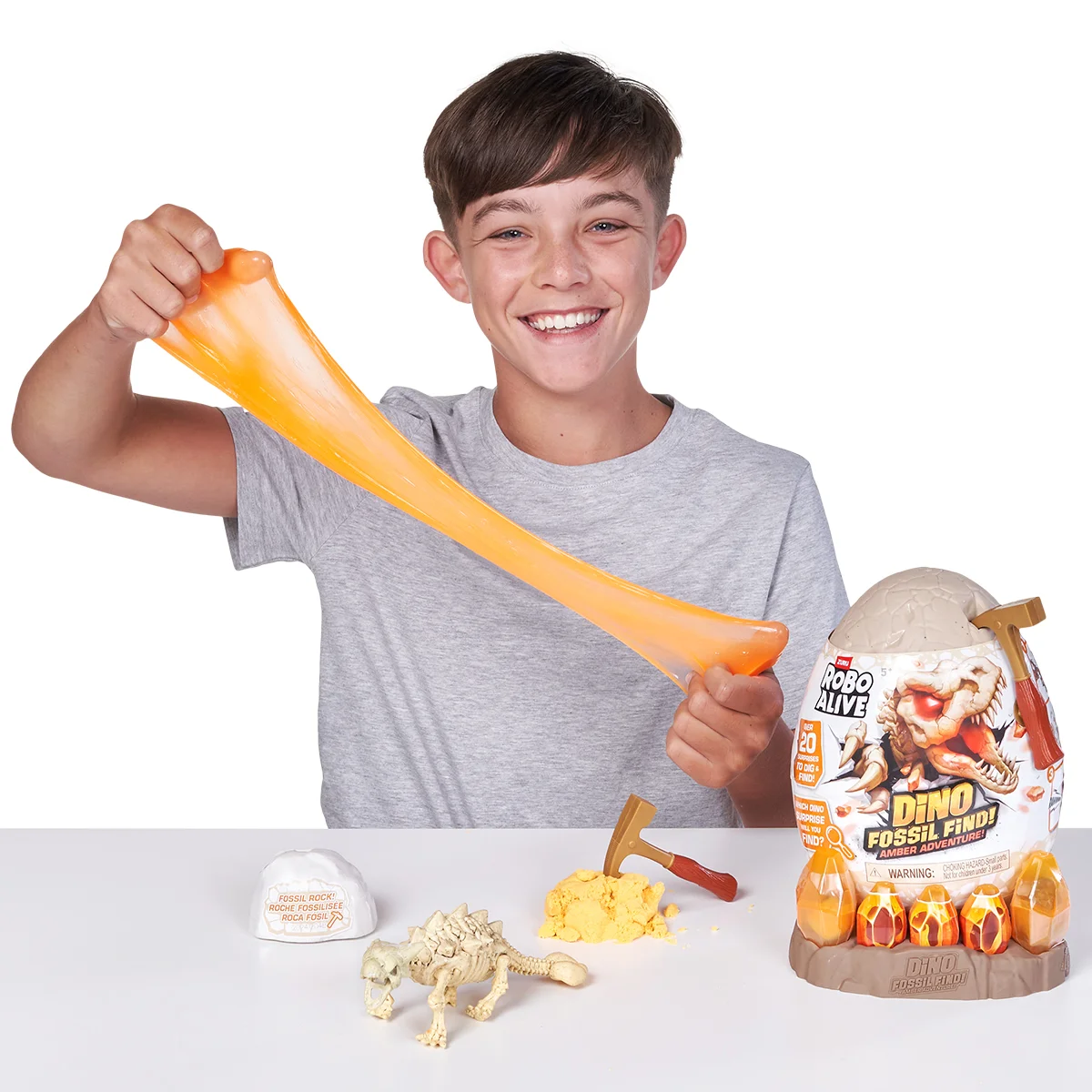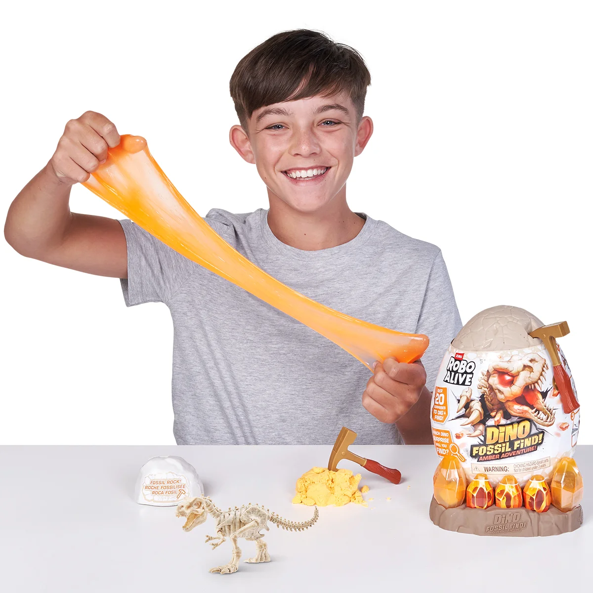 Інтерактивний ігровий набір-сюрприз ROBO ALIVE - БУРШТИНОВІ РОЗКОПКИ ДИНОЗАВРА - чудовий подарунок для маленьких шанувальників динозаврів і скам'янілостей! Це величезне яйце, всередині якого знаходяться заховані частини скелета динозавра. Знайдіть усі елементи - в слаймі, в піску, в камені – та зберіть скелет!