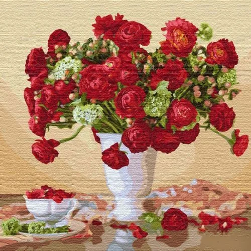 Картина за номерами "Багряний букет (big)". Для того, щоб намалювати картину, необхідно малювати по пронумерованим контурам, які відповідають кольору фарби. У наборі: натуральне полотно на підрамнику з галерейного натяжкою, паперова дублікат з контурним малюнком картини (на картині нанесена схема контурів зображення з нумерацією), 3 нейлонові художні кисті, палітра акрилових фарб в контейнерах. Всі необхідні фарби вже в комплекті і не вимагають змішування. Розмір: 50 х 50 см. Кількість кольорів: 35. Складність - ★★★★.