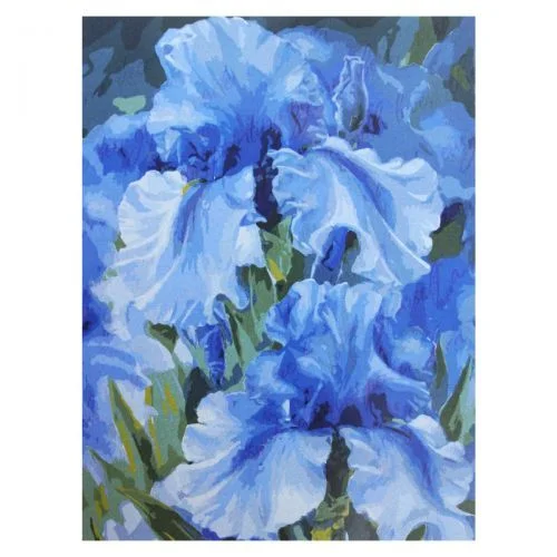 Картина за номерами "Блакитні іриси". Для того, щоб намалювати картину, необхідно малювати по пронумерованим контурам, які відповідають кольору фарби. У наборі: натуральне полотно на підрамнику з галерейною натяжкою, паперова дублікат з контурним малюнком картини (на картині нанесена схема контурів зображення з нумерацією), 2 нейлонові художні кисті, палітра акрилових фарб в контейнерах. Всі необхідні фарби вже в комплекті і не вимагають змішування. Розмір: 30 х 40 см. Кількість кольорів: 22. Складність - ★★★.