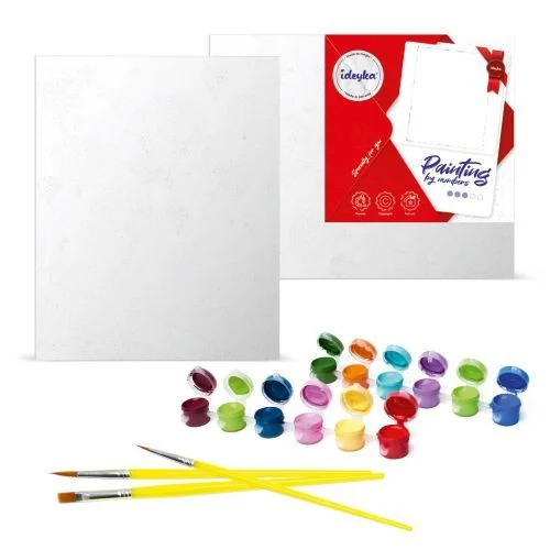 Комплектація: Полотно на підрамнику з галерейного натяжкою, паперова інструкція з контурним малюнком картини, нейлонові кисті, палітра акрилових фарб в контейнерах, кріплення
