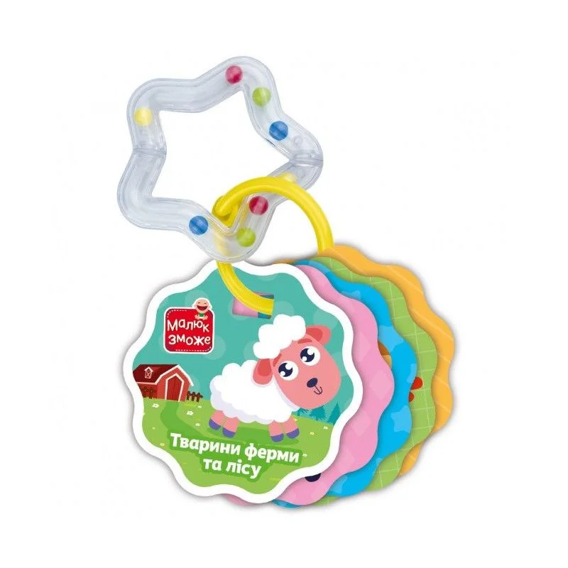 Овечка, ведмедик та інші звірятка сумують і хочуть побавитись з малюком. Познайомте їх і розкажіть хто на якому малюнку зображений. Грайте брязкальцем і розважайтесь.