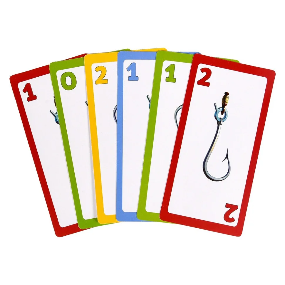 Комплектація: картки риби - 60 шт., картки наживки - 40 шт., жетони - 58 шт., картки-підказки - 4 шт., жетон головного гравця, інструкція.