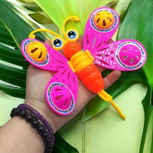 Яскрава дитяча каталка у вигляді метелика. До іграшки на колесах кріпиться паличка-ручка, за яку малюк і возитиме каталочку. Під час руху метелик махає крилами та торохтить (за рахунок спеціального механізму). Розмір (із ручкою) - 50х17х13 см. Є різні види в асортименті.