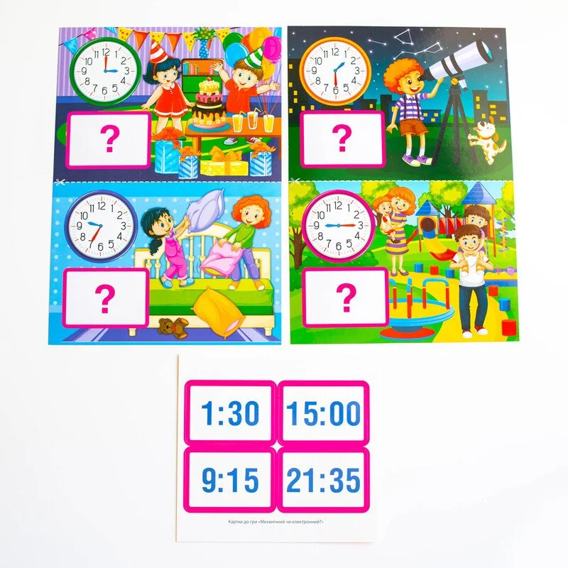 - Знайомити дітей із годинником, призначенням циферблата і годинникових стрілок, вчити визначати та встановлювати час на макеті годинника. Розповідати про відмінності у відліку часу між механічними та електронними годинниками.