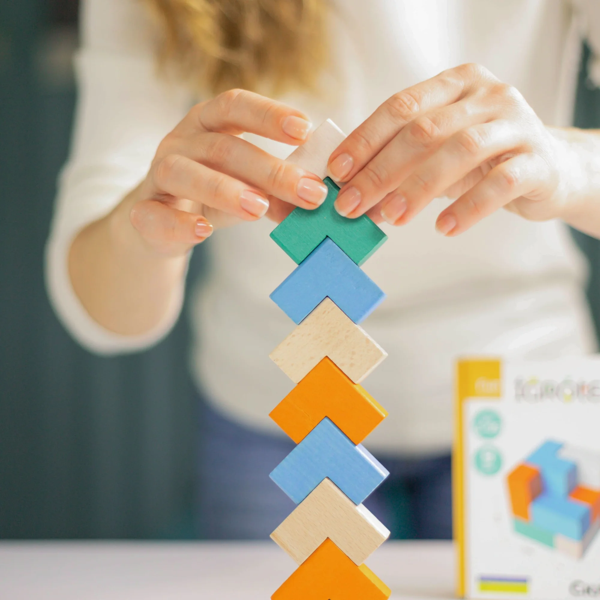 Це може здатися дуже простим завданням, але, повірте, навіть дорослим буде цікаво спробувати свої сили! З деталей можна складати пласкі та об'ємні фігури, будувати вежі та бавитися як з балансиром.