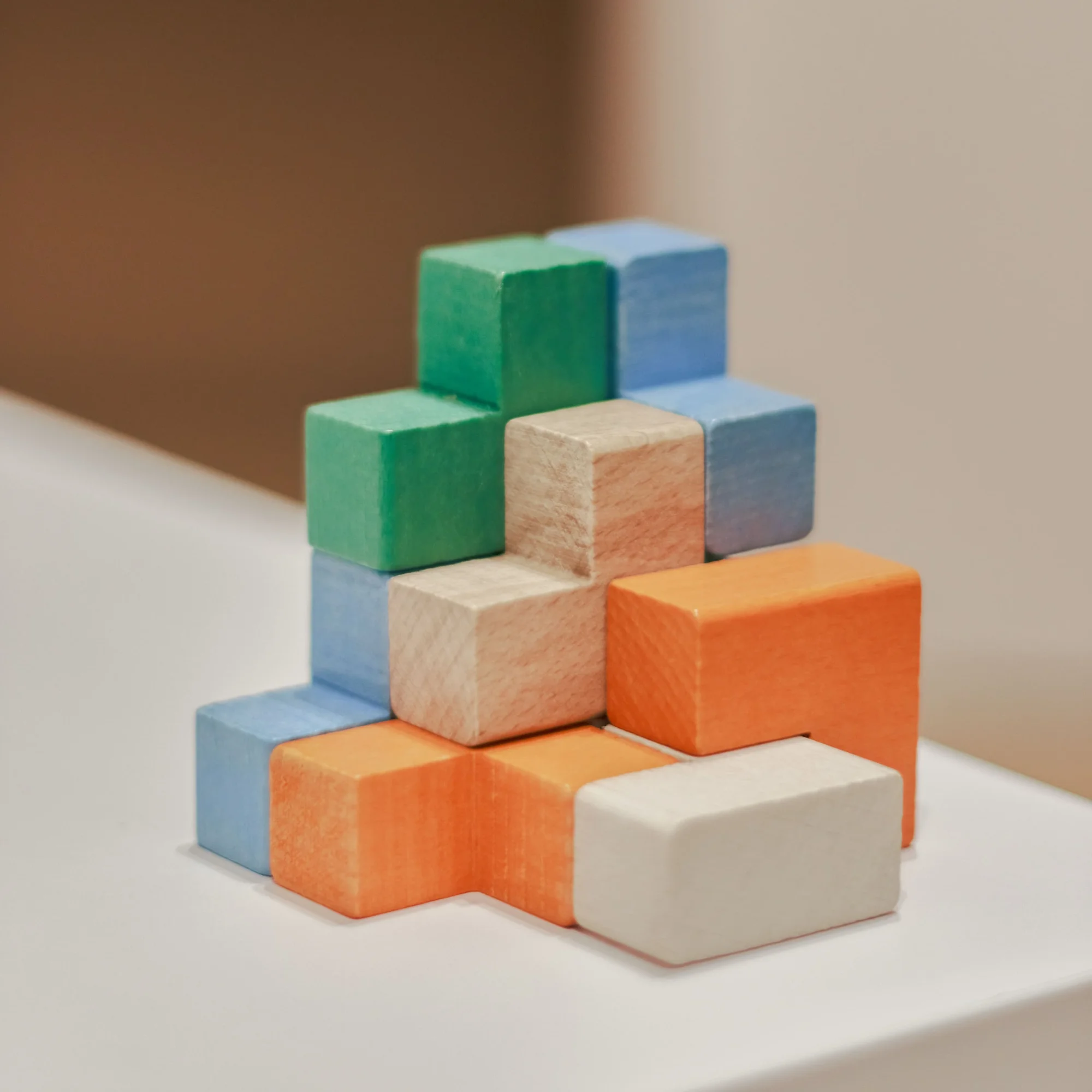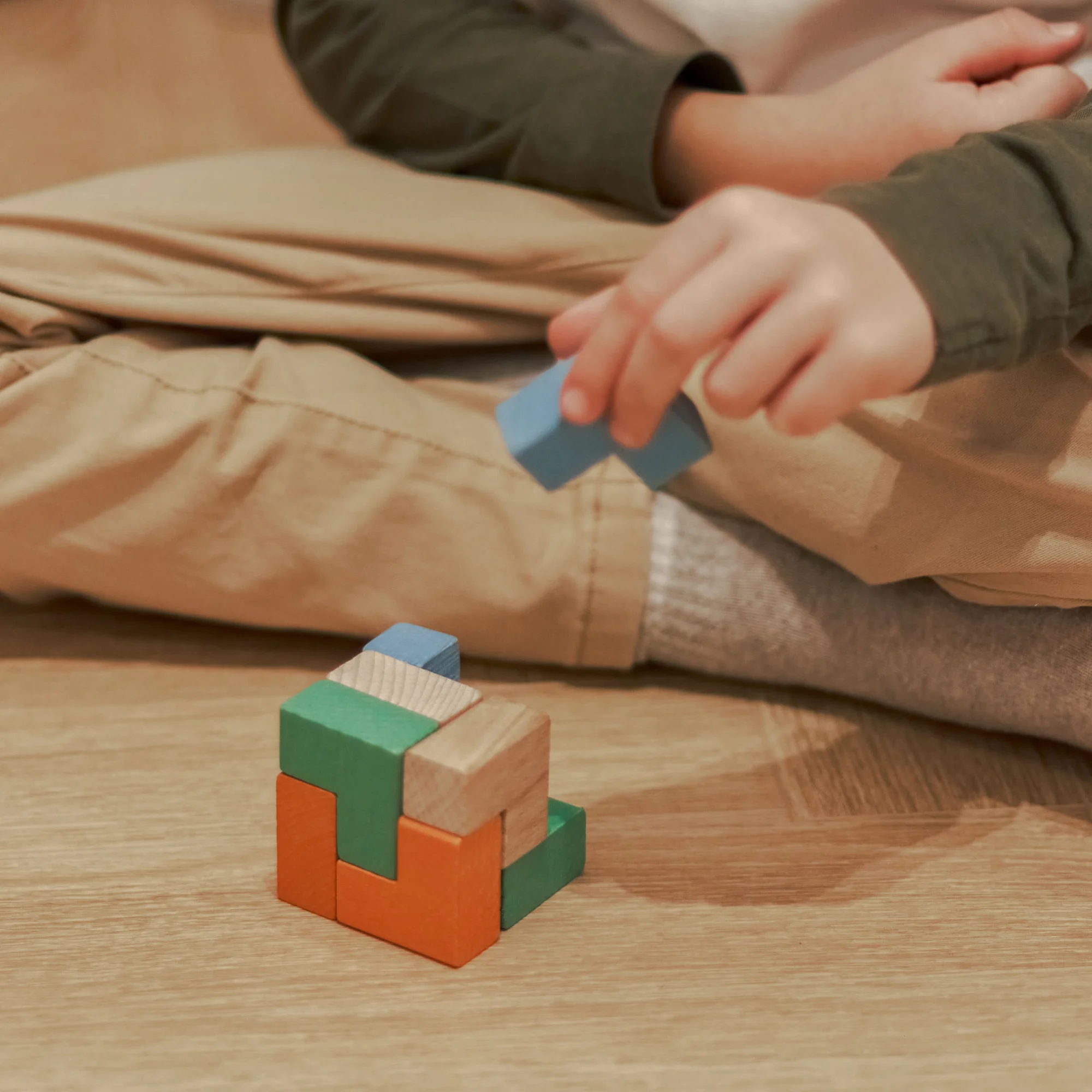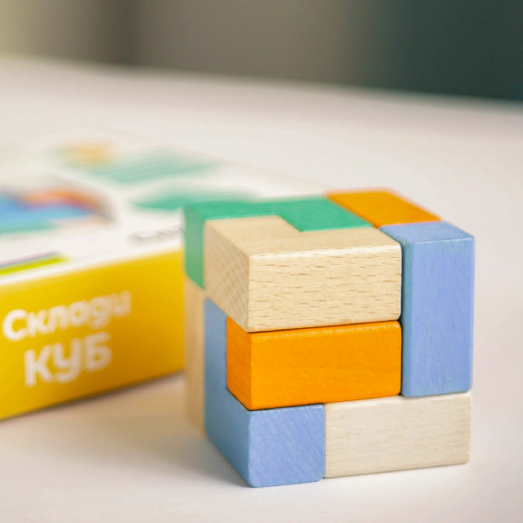Дерев'яна головоломка складається з дев'яти кольорових елементів однакової форми. Основна задача — скласти з них куб.