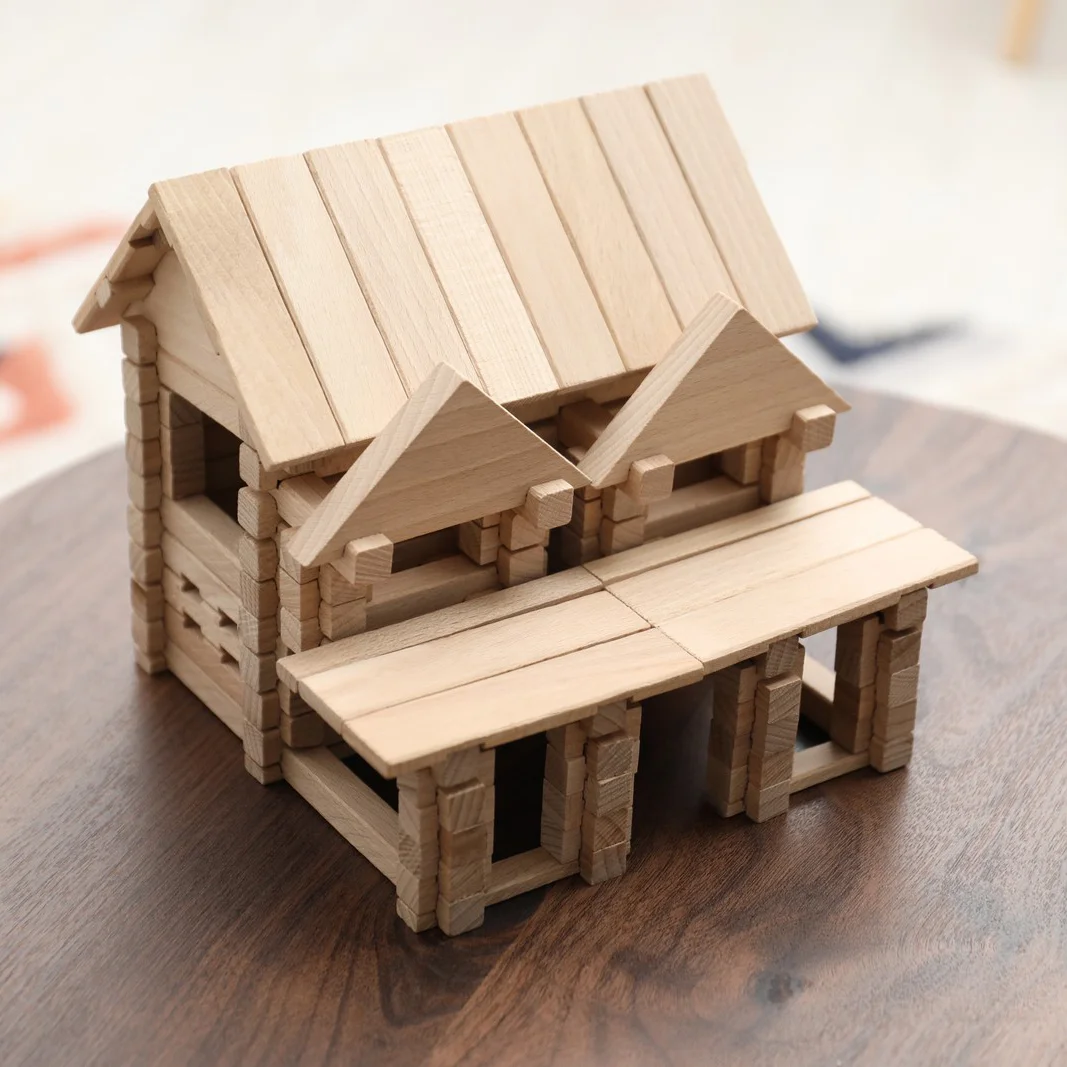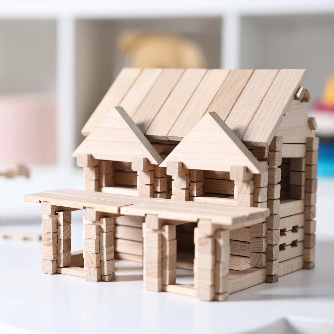Складання виробу зі 136 деталей - серед яких бруси, півбруси та елементи для побудови дахової конструкції - дасть дитині розуміння основ будівництва помешкань зі зрубу - аутентичному українському методу зведення хат у Карпатах. Бруси та півбруси мають пази для скріплення між собою. Січення брусів - квадратне. Найкоротша деталь - 24 мм. Найдовша - 180 мм.