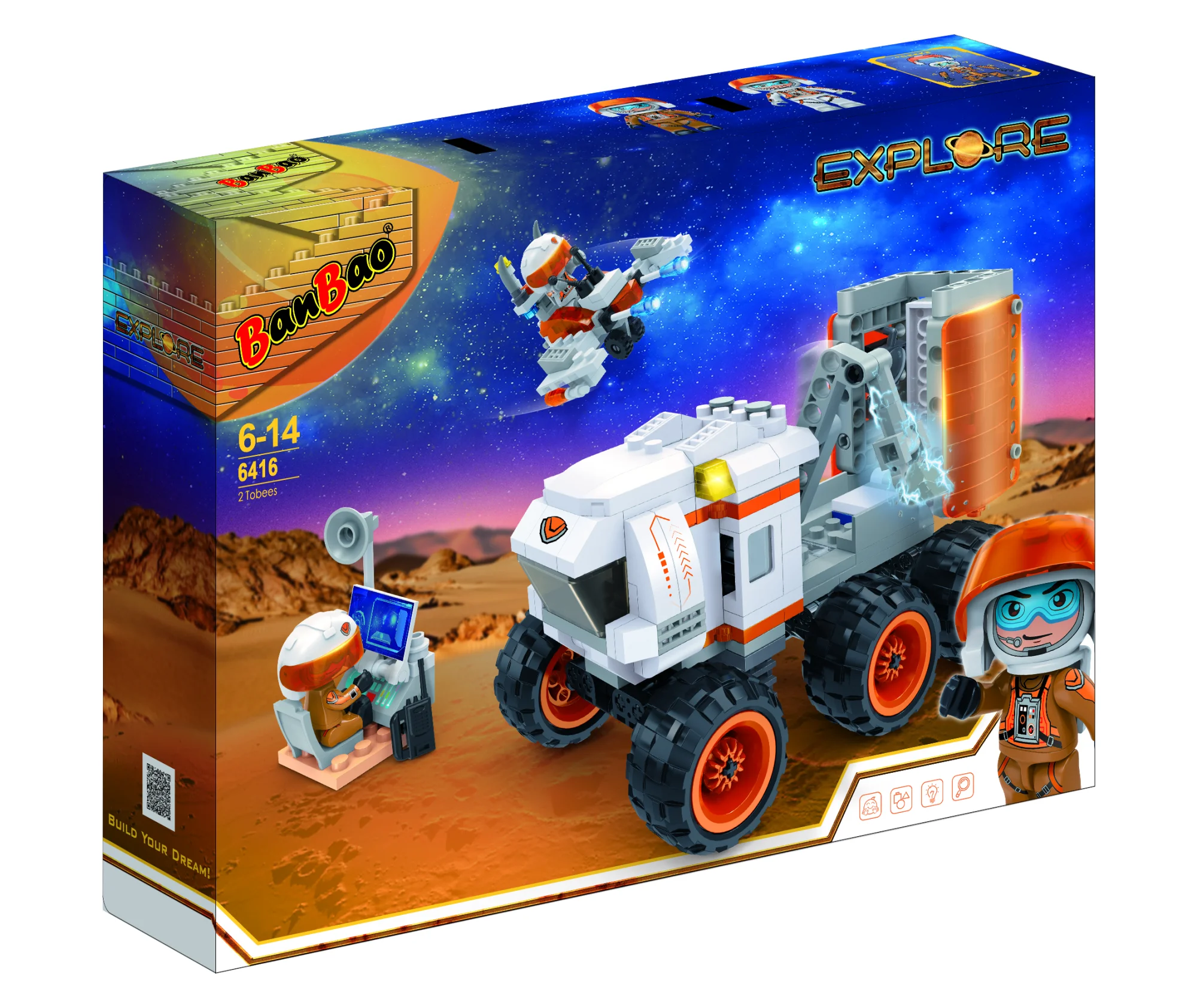 Набір складається з марсохода, планетохода, космічного обладнання та 2 фігурок космонавтів.