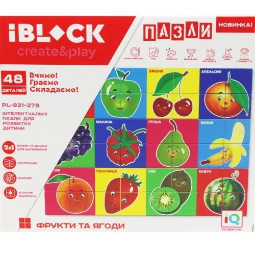 Пазл з дошкою для малювання "2в1" має великі деталі, які підійдуть маленьким дітям для вивчення предметів, кольорів та для тренування дрібної моторики. У комплекті є 48 деталей пазла, двостороння дошка (одна сторона для малювання маркерами, а друга для збирання конструктора) та 2 маркера.