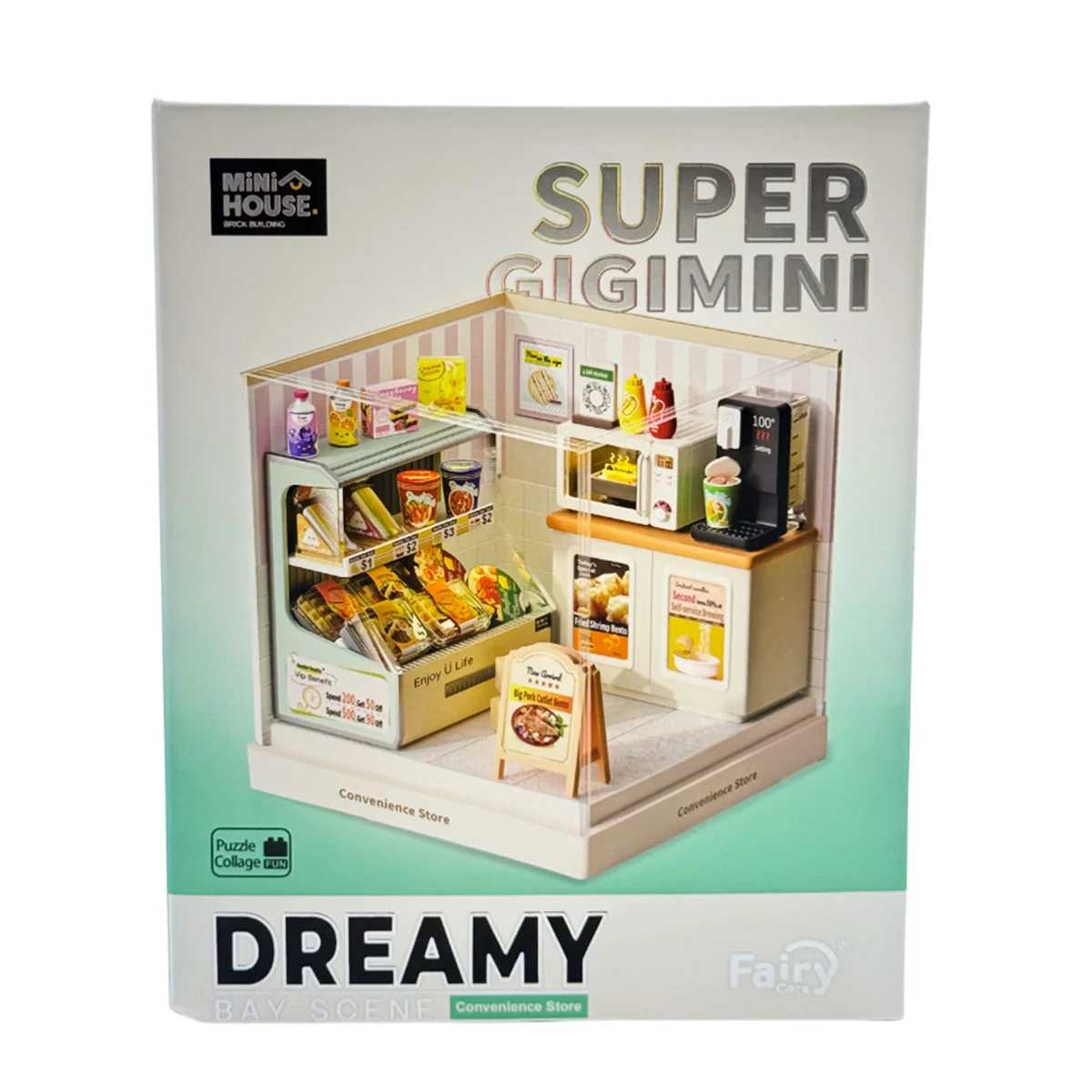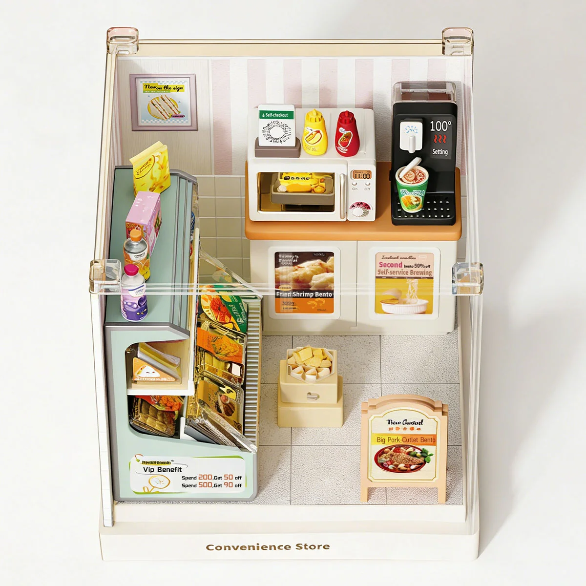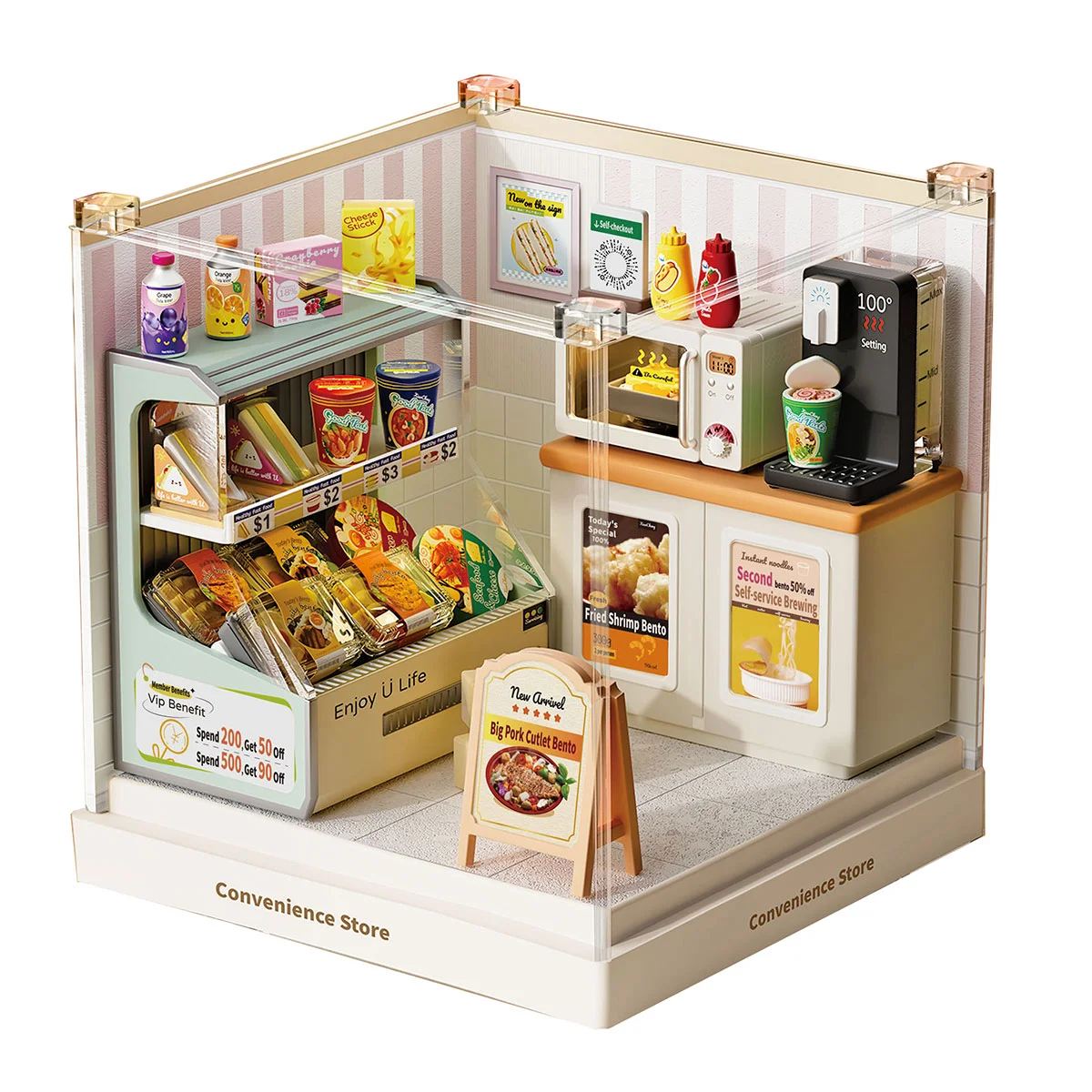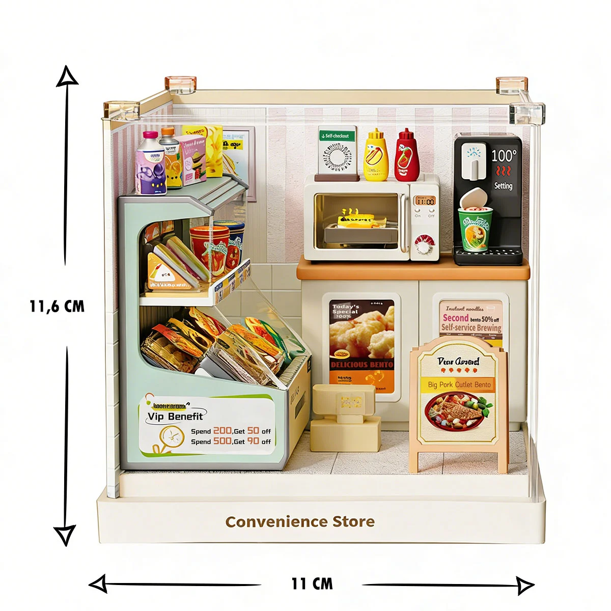 У наборі відтворено атмосферу іграшкового невеликого магазину з прилавком, вітринами та полицями з товарами. Мініатюрні упаковки, напої, снеки, кавова зона та касові елементи формують впізнаваний простір повсякденних покупок і додають сцені реалістичності. Прозорий бокс дозволяє розглядати інтер’єр як колекційний об’єкт або елемент декору.