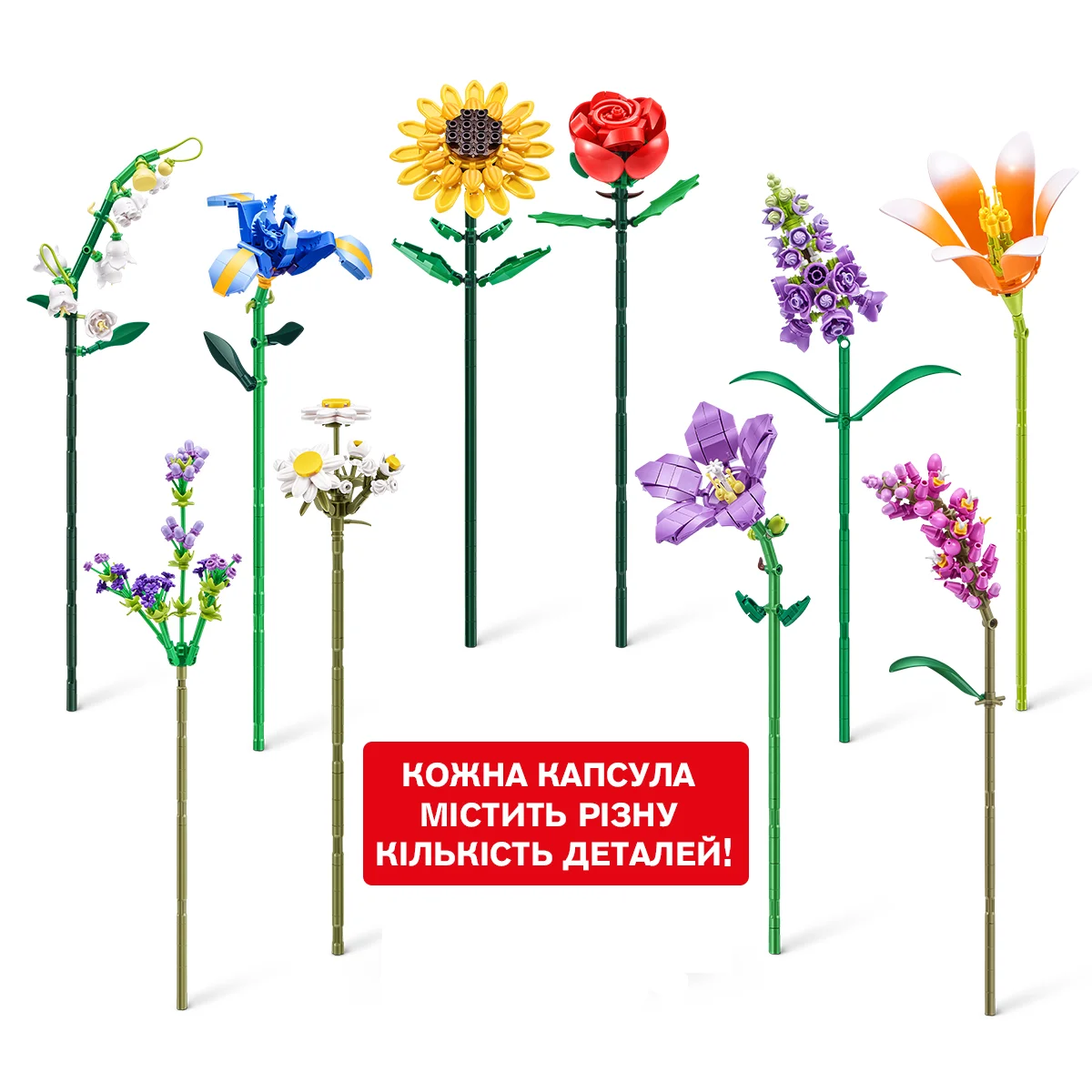 - Кожна капсула містить різну кількість деталей для збирання 2 квіток і просту інструкцію в картинках.