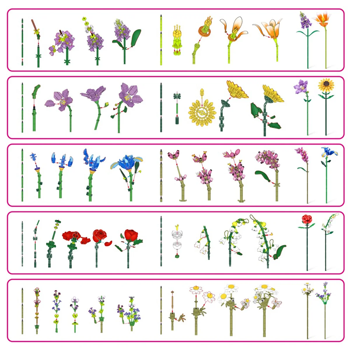- 10 різних квітів у серії: лілія та матіола інкана (232 деталі); персикарія та ірис (237 деталей); платикодон і соняшник (212 деталей); ромашка та лаванда (243 деталі), а також троянда та конвалія (204 деталі).