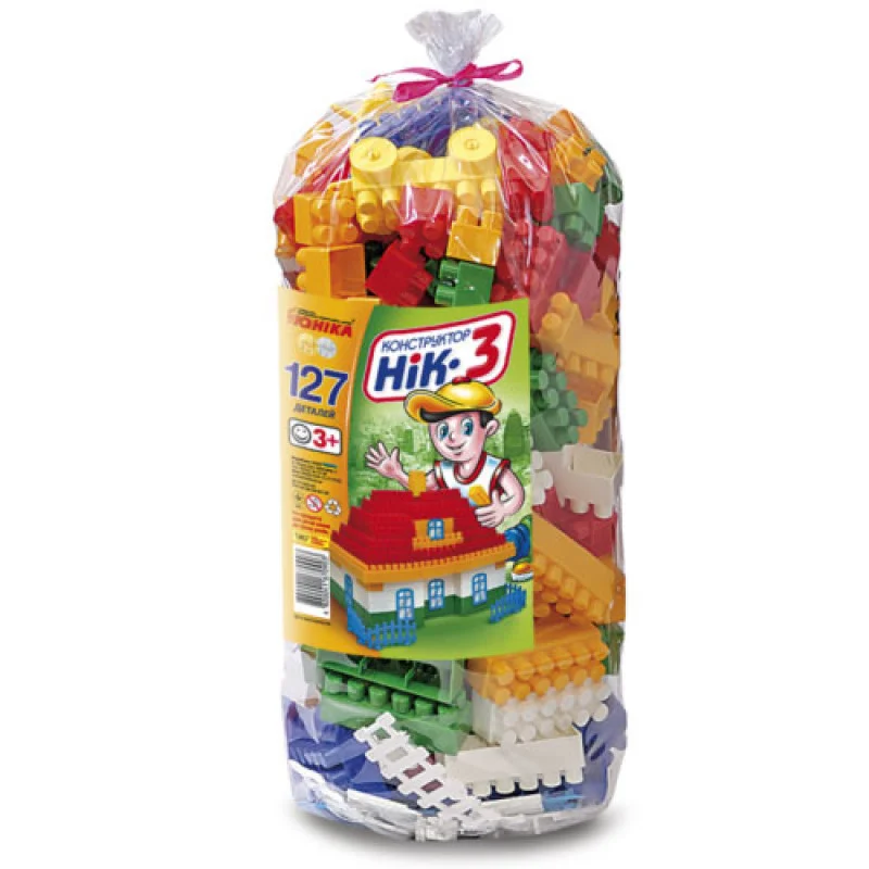 Захоплюючий дитячий конструктор "НІК - 3" (паяний пакет) 70903, рекомендований для малюків старше трьох років, поєднує в собі яскраве виконання і відмінну якість виготовлення з використанням ударостійкого пластику. Всі 127 елементів, що входять в ігровий набір, мають ергономічною формою, абсолютно безпечною для маленьких діток. Для розробки розвиваючої серії конструкторів виробник застосував нетоксичний сировину, яке не викликає у малюків небезпечних реакцій, подразнень або сліз. Конструктор упакований в зручний прозорий мішечок із зав'язками, де жодна деталь не загубиться. Заняття з конструювання допомагають розвивати дрібну моторику, логічне та образне мислення, а також стимулюють тренування зорового і колірного сприйняття. Виробник передбачив оптимальний розмір кожного елемента, щоб Ваш цікавий малюк не зміг випадково проковтнути дрібну деталь. Завдяки гладкій поверхні детальки ігрового комплекту легко чистяться за допомогою вологої губки або води, щоб іграшки малюка завжди виглядали максимально презентабельно.
