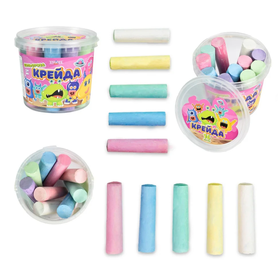 В цьому пластиковому контейнері ви знайдете крейду 16 штук. Ними можна малювати практично на будь-якій поверхні. Крім того, контейнер має зручну форму та легко відкривається, що дозволяє швидко та комфортно використовувати крейду.
