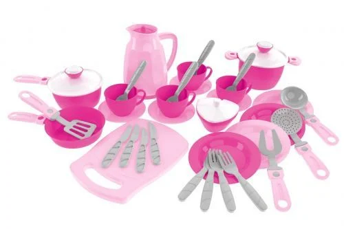 Іграшка "Кухонний набір 4". У наборі 38 елементів (в т.ч. кавник і дощечка для нарізки) виконаних в оригінальній кольоровій гаммі модельної лінійки Кухонних наборів ТехноК. Комплектація: сковорідка, каструля, сотейник, цукорниця з кришкою, кавник з кришкою, дощечка для нарізки, черпак, шумовка, вилка велика, лопатка, кришка - 2 шт., Тарілка - 4 шт., Блюдце - 4 шт., Чашка - 4 шт., ложечка - 4 шт., вилка - 4 шт., ніж - 4 шт.