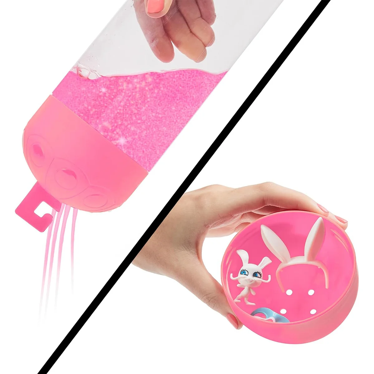 - Неймовірний сюрприз - дістань лялечку з контейнера та наповни його водою. Вау! На лялечці спеціальне таємне покриття. Давай швидше дізнаємося, який сьогодні костюм буде у Марінетт. Помісти ляльку всередину контейнера, покрути її - і ось уже Марінетт перетворюється прямо на твоїх очах.