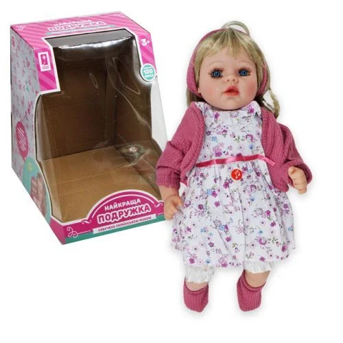 Лялька-пупс в гарному та реалістичному дизайні. Голова, ніжки та ручки – із пластику, тіло – м'яке. Одягнений у милий костюм. Оснащений звуковими ефектами: фрази, віршик та пісенька (усього 8). Розмір - 46 х 24 х 10 см. Українською мовою.
