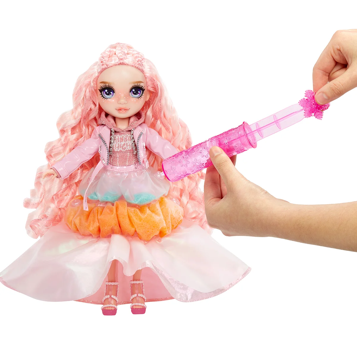 - у ляльки чарівний «сніг» в одязі! За допомогою шприца, додайте до снігу трохи прохолодної води та спостерігайте, як сніг чарівним чином розпушується та змінює колір, змінюючи образ модниці;