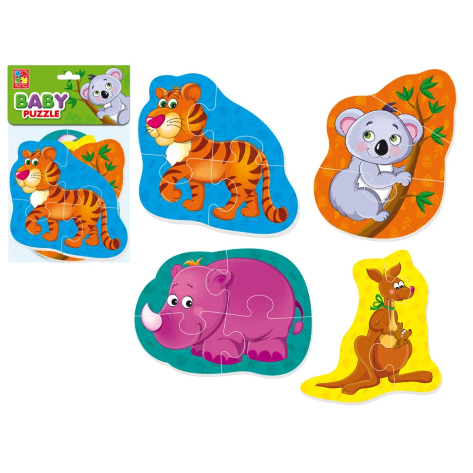 Дитячі м'які пазли з тваринами - це чудовий спосіб розвивати дрібну моторику та логічне мислення вашого малюка, пропонуючи йому цікаві завдання із складанням. Набір містить 4 картинки з різними тваринами: носорігом, коалою, кенгуру та тигром, і розглядається у трьох різних рівнях складності - 2, 3 і 4 деталі.