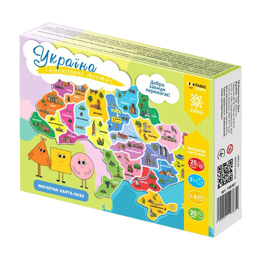 Великий пізнавальний, патріотичний пазл на магнітній основі з 25 елементів. Цікава розвага, тренажер для пам’яті й уваги. Розвиває дрібну моторику, мислення і фантазію дитини, знайомить з найвизначнішими пам’ятками різних регіонів нашої держави. Крім того, його можна збирати також на будь-якій вертикальній металевій основі, зокрема на холодильнику чи ігровій магнітній дошці.