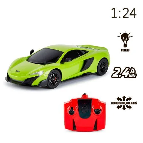 Стильна машинка на радіокеруванні, копія існуючої моделі у масштабі 1:24. Їде вперед, назад, вправо і вліво. Машинка працює від 3-х батарейок АА, пульт управління - від 2-х батарейок АА (батарейок немає в комплекті). Фари світяться під час їзди. Іграшка виготовлена із міцного пластику. Довжина машини: 20 см.