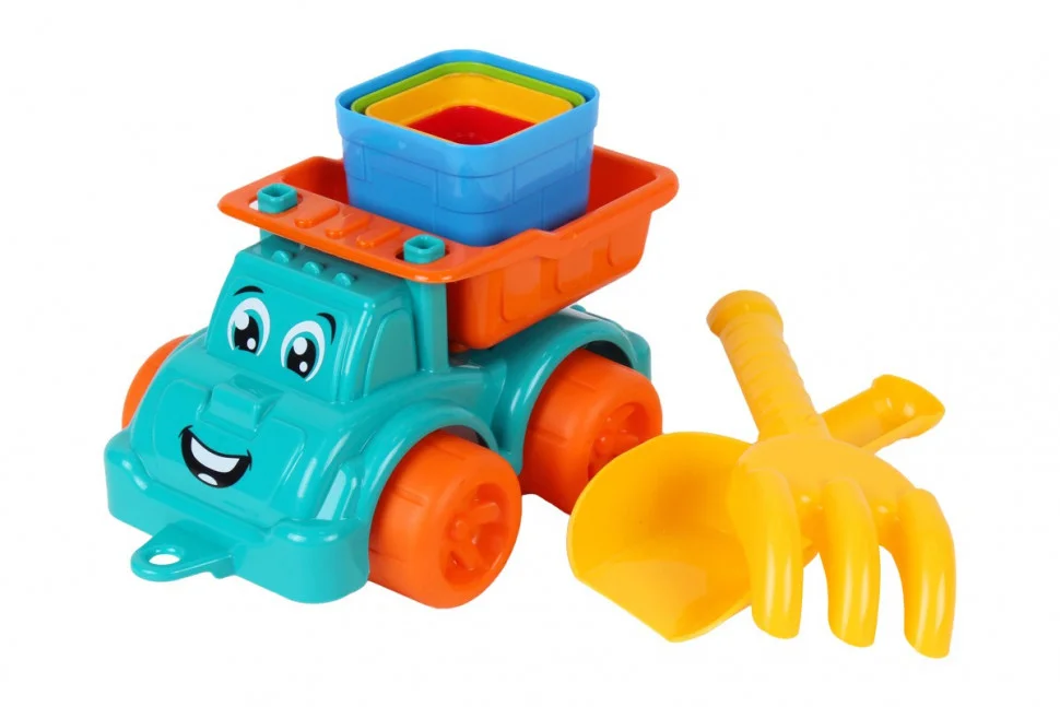 Пісочний набір це універсальна і цікава іграшка - можна грати самоскидом будинку або перевозити пісочок в пісочниці, будувати пірамідку або формувати пасочки. З такими іграми малюк вивчає форми, кольору, порівнює розміри і робить перші кроки в рахунку. Зображені вічко і посмішка на самоскиді, нанесені методом штампопечаті, додають іграшці емоції і принесуть дітям радість.