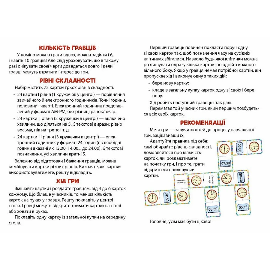 Ця гра із серії «Математичне доміно» допоможе дітям легко навчитися визначати час за звичайним та електронним годинником і надасть можливості проводити дозвілля в колі сім’ї або друзів не лише із задоволенням, а й з користю!