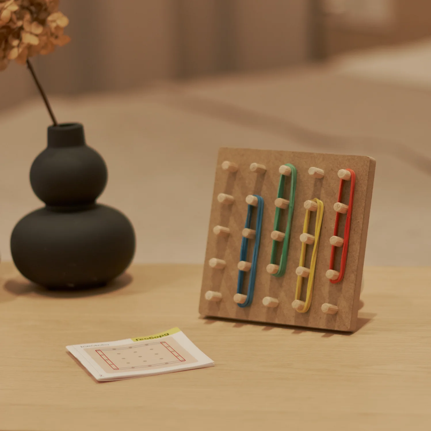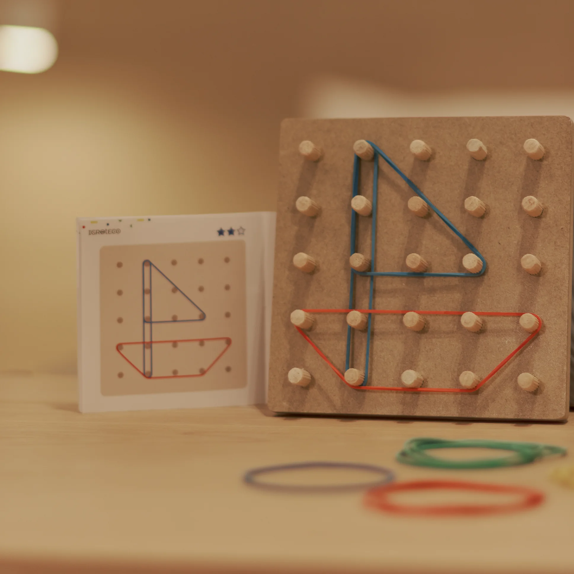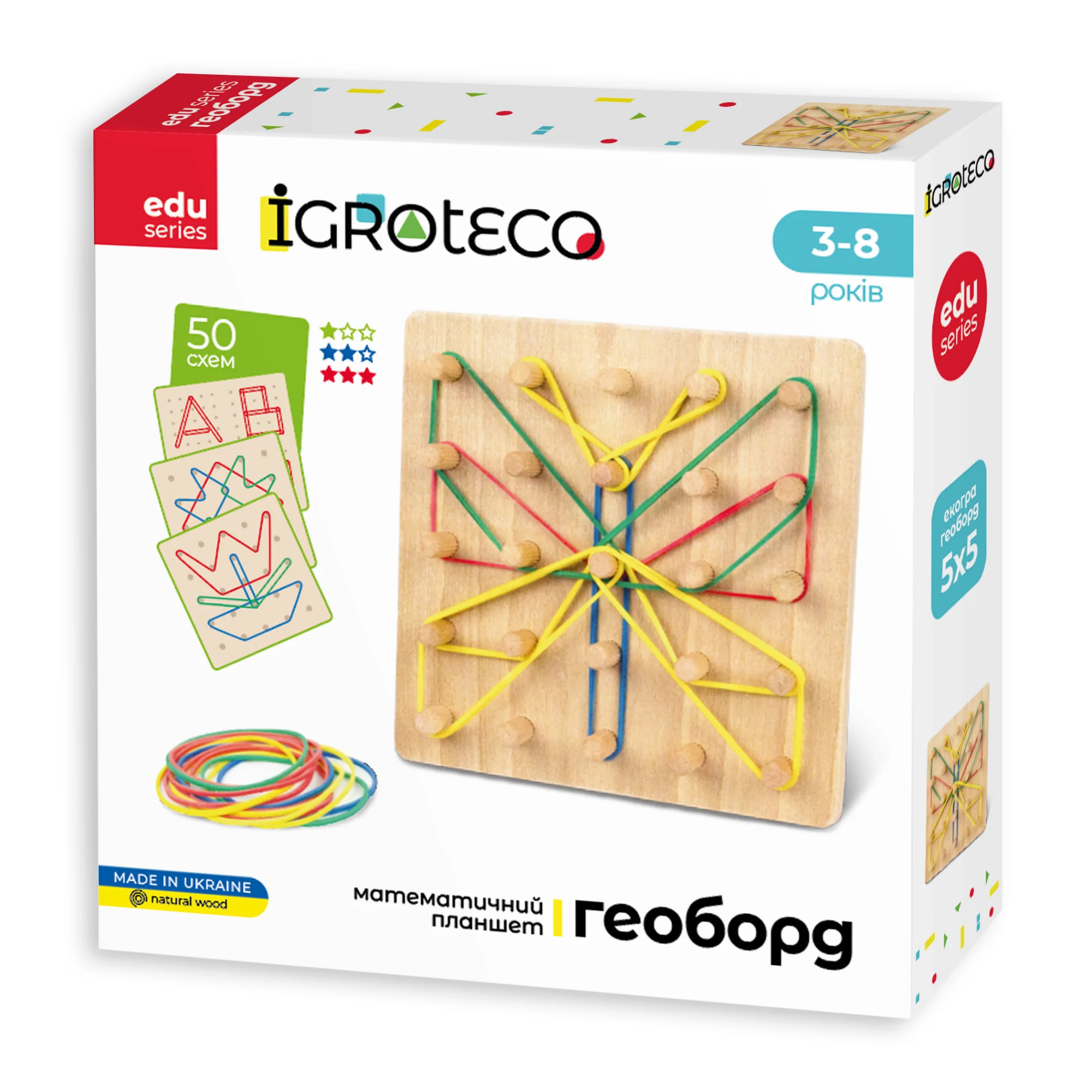 У наборі: дерев’яний геоборд розміром (15 × 15 см), 12 кольорових гумок, книжечка із завданнями.
