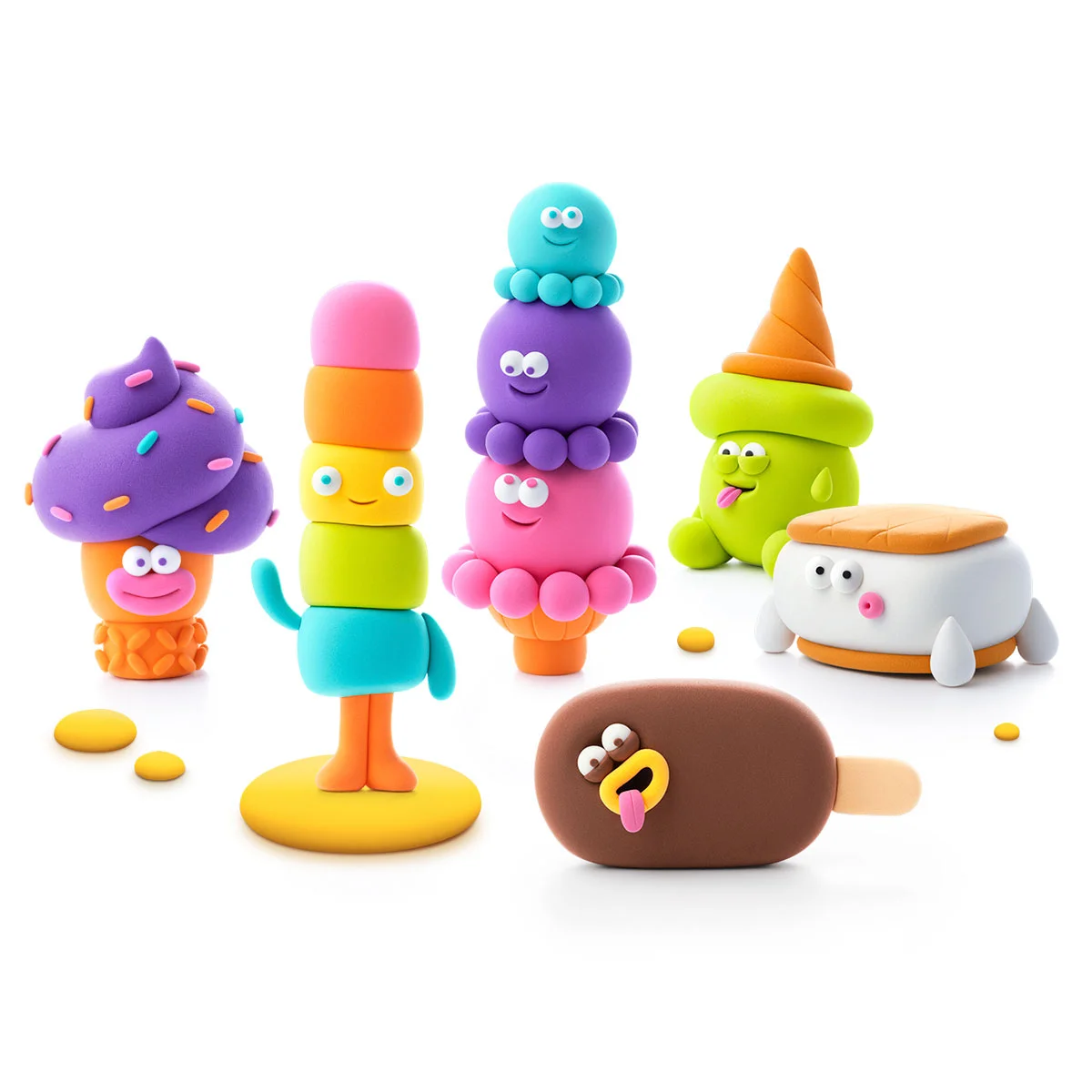 Меганабір пластиліну, що самостійно твердіє, ЛІПАКА – ФАЙНІ МОРОЗИВКА – розважить і малюків і дорослих. За допомогою анімаційних інструкцій в додатку HEY CLAY, Ви зможете зліпити 6 унікальних персонажів: Торнадика, Тепльодика, Кульконавтів, Єті Сендвіч, Ріжок Кувирок і Чоко Бро. Пластилін твердіє на повітрі протягом 24 годин, після чого можна гратися створеними фігурками.