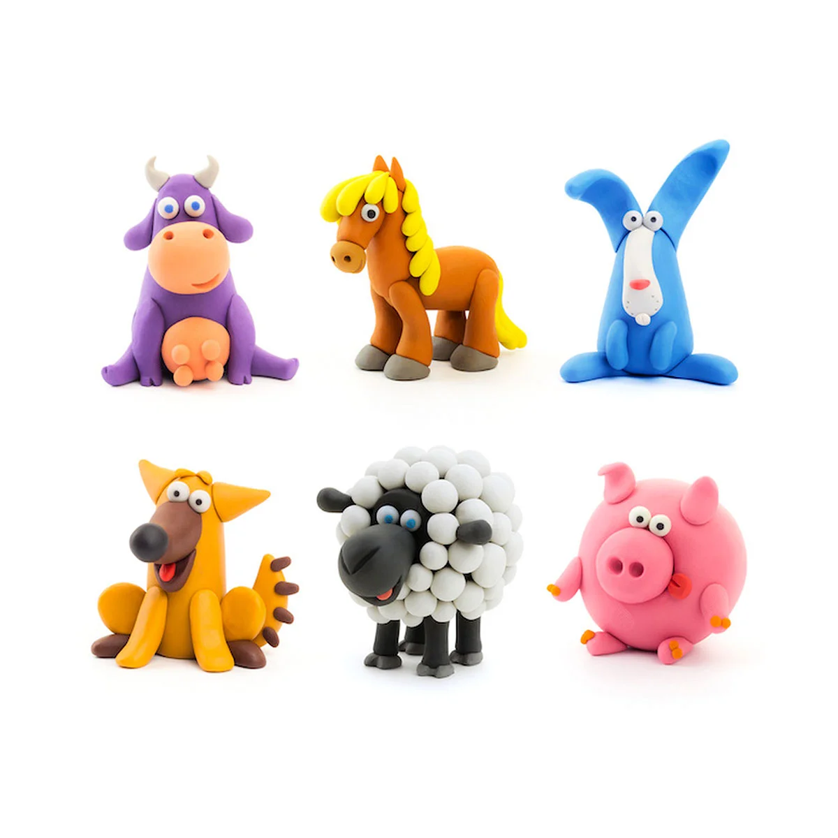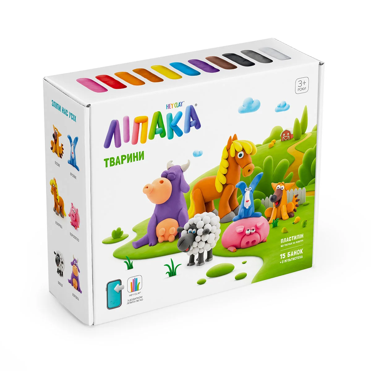 Меганабір пластиліну, що самостійно твердіє, ЛІПАКА – СВІЙСЬКІ ТВАРИНИ – розважить і малюків і дорослих. За допомогою анімаційних інструкцій в додатку HEY CLAY, Ви зможете зліпити кумедних тваринок: корівку, коника, кролика, свинку, собачку та вівцю. Пластилін твердіє на повітрі протягом 24 годин, після чого можна гратися створеними фігурками.