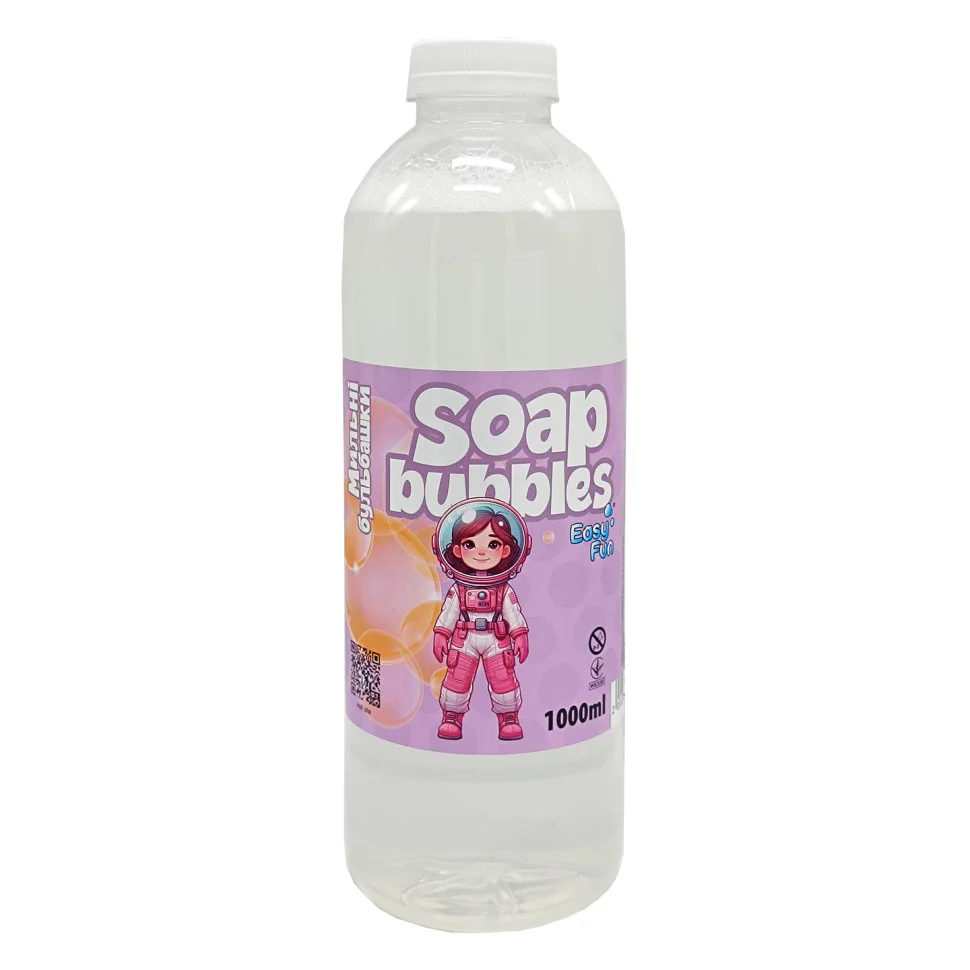 Іграшка дитяча. Мильні бульбашки «Easy Fan». Об'єм 1000 мл (ml). Попередження! Використовувати за призначенням. Не використовувати поблизу електроприладів. Не для внутрішнього застосування! Іграшка призначена для дітей віком від 3 років. Дітям до 14 років використовувати під наглядом дорослих. Можливе відокремлення дрібних деталей, що становить ризик удушення дрібними деталями. При попаданні розчину в очі чи рот, необхідно промити їх великою кількістю води та звернутись до лікаря. Особливості умов зберігання: зберігати в сухому місці при температурі від +5 до +25 С та відносній вологості не більше 60%. Матеріал флакону пластик. Мильний розчин нетоксичний, стійкий до низьких температур. Підходить до генераторів мильних бульбашок. Зберігати етикетку з даними виробника. Склад: вода, гліцерин, поверхнево-активні речовини. Номер партії співпадає з датою виготовлення. Строк придатності: 3 роки.