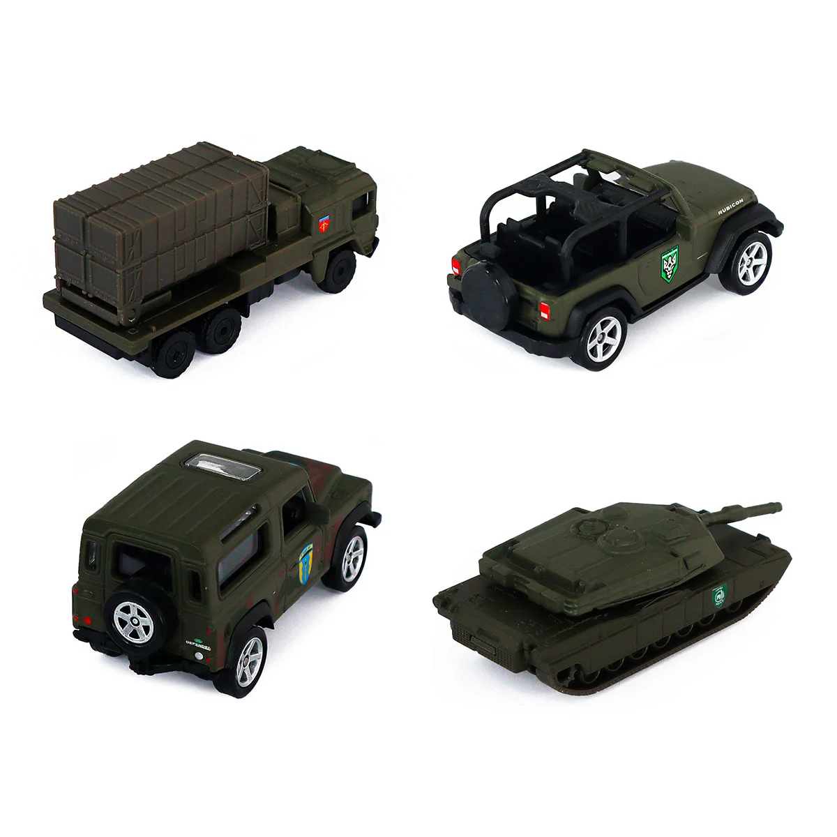 - До дисплея мінімоделей входить: танк "1 ОТБр", реактивна система залпового вогню "96 ЗРБр", штурмова машина "БОП НГУ ім. Кульчицького", Jeep Renegabe Trailhawk "Айдар".