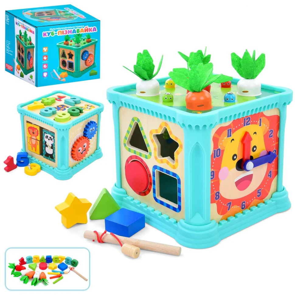 Наш ігровий куб — це універсальний навчальний і розвиваючий іграшка, яка подарує вашій дитині безліч веселих моментів! Розміром 17x17x15 см, куб оснащений різноманітними активностями, які допомагають розвивати моторику, логічне мислення та творчі навички. На одному з боків куба знаходиться сортер з різними формами, де діти можуть вчитися розпізнавати геометричні фігури. Інший бік містить шестерні, які цікаво обертати, вивчаючи основи механіки. Цифри на кубі допоможуть малюкам познайомитися з основами математики, а годинник — з поняттям часу. Куб також включає унікальну гру "Рибалка", де дитина за допомогою магнітної вудки ловить "рибку" серед різноманітних овочів, таких як гусениці та морква, що перетворює навчання в цікаву гру на свіжому повітрі — в саду або городі. Ця іграшка стане чудовим доповненням до ігрових моментів вашої дитини, забезпечуючи її розвиток у захоплюючий та ігровий спосіб!