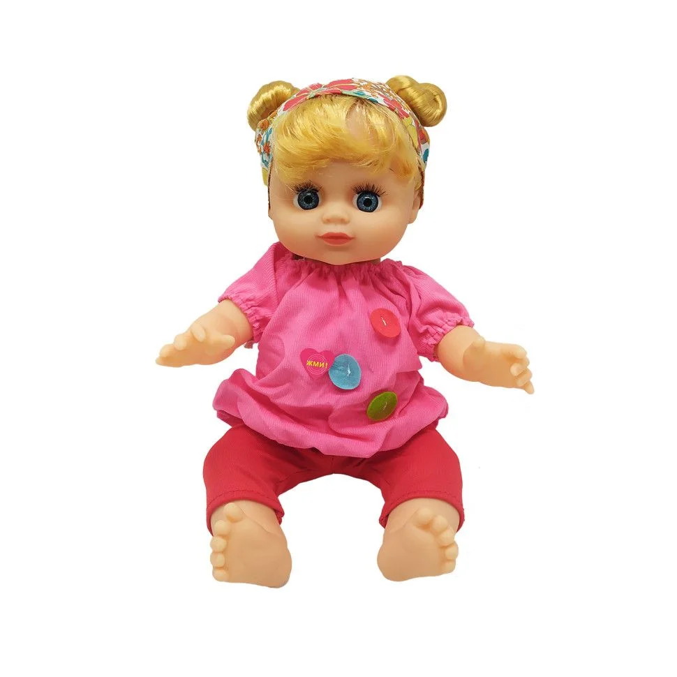 Лялька-пупс "Аліна", музична. З красивою зачіскою та в сукні. Рухливі руки, ноги та голова. При натисканні на кнопку - говорить фрази російською мовою (6 фраз), співає пісеньку. Прозорий рюкзак.
