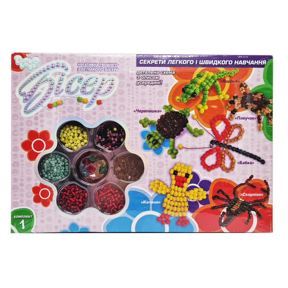 Набір для творчості «Бісер». У цьому наборі Ви знайдете безліч видів бісеринок, які відрізняються за кольором і розміром, спеціальну міцну нитку-волосінь для нанизування намистинок, а також докладну інструкцію з описом і схемами прикрас, які можна зробити за допомогою цього набору.