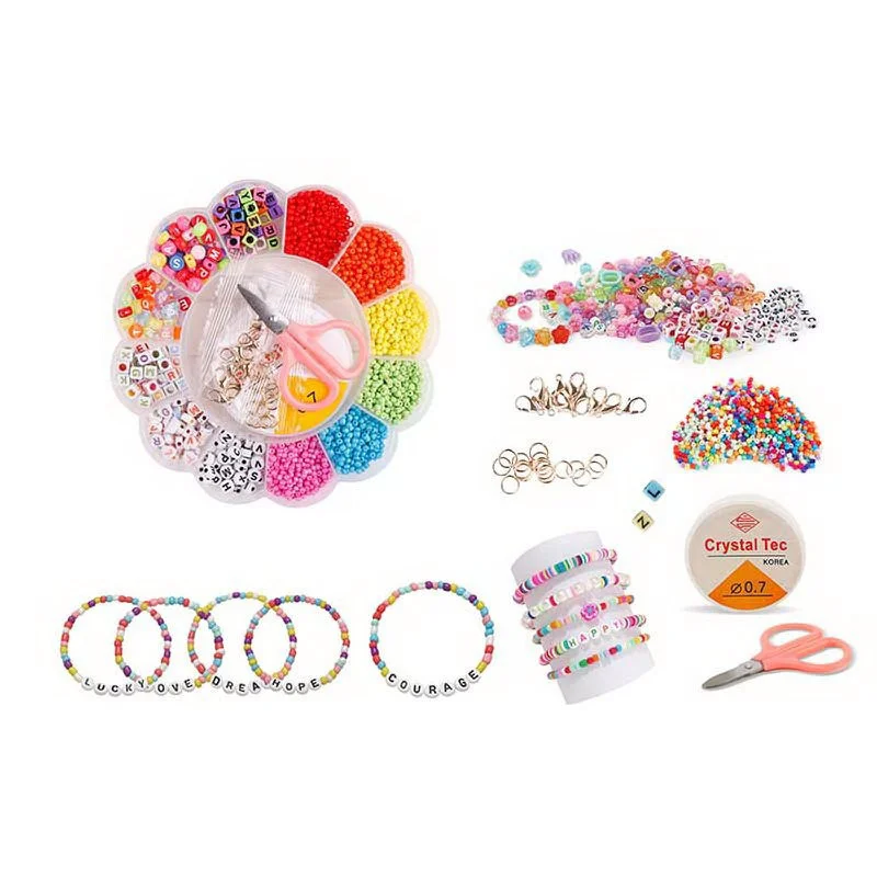 Повний комплект для старту: Вам не потрібно нічого докуповувати – у коробці є бісер, намистини та еластична гумка для нанизування.