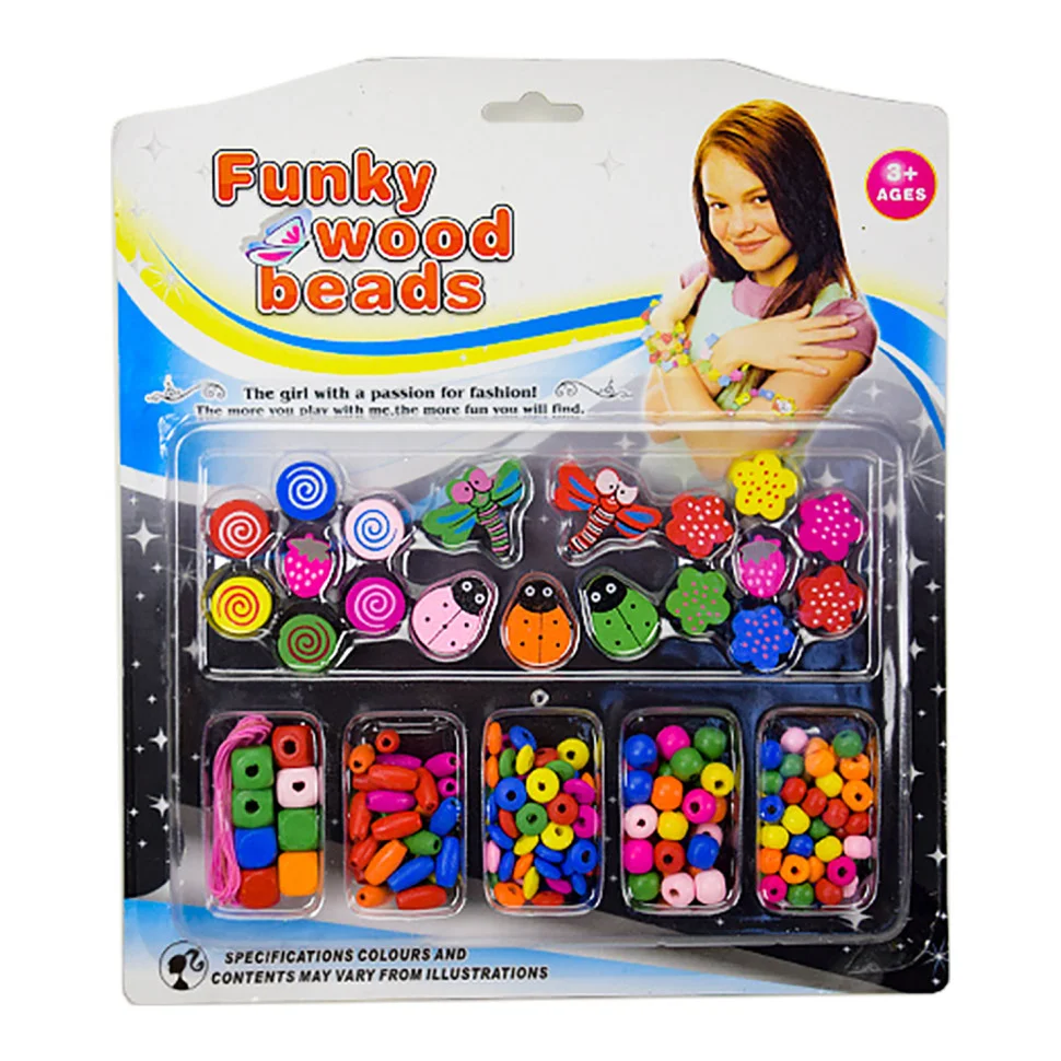 Набір дерев'яних бусинок для плетіння, які можна навісити на гумку та створити унікальний браслет.